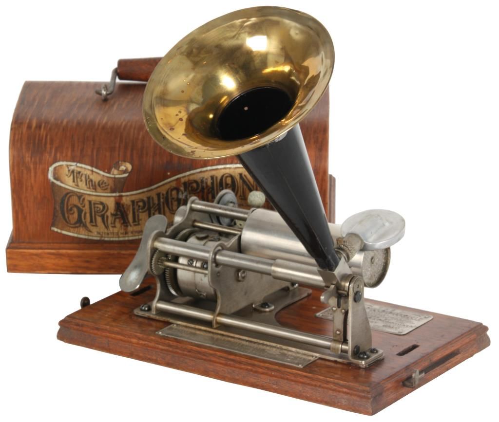 Columbia Model BX Graphophone “The Eagle”. Oak case with domed lid; has a skeletonized movement with nickel plated finish, spring driven with butterfly key wind on the side. Brass bell shaped horn with black painted cone 8.5 in. long x 5.5 in. dia. 2 metal tags, one reads “Columbia Phonograph Co. sole sales agent for the American Graphophone Company” and the other “The Graphophone” model BX and serial number 426534. In good condition, drive belt is broken. 12 in. high x 12 in. wide x 14 in. deep.