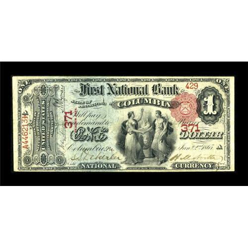 <B>Columbia, PA</B></I> - $1 1875 Fr. 384 <B>The First NB</B></I> Ch. # 371<BR> An attractive Lancaster County example from a by no means common bank. We sold this colorful blue end paper note in our January, 1997 sale, and it has been off the market since, with Track & Price showing only one other First Charter offering from here during the last decade. Bright <B>Very Fine.</B></I><BR><BR><b>Shipping:</b> Coins & Currency (<a target="_blank" href="http://www.heritageauctions.com/common/shipping.php">view shipping information</a>)