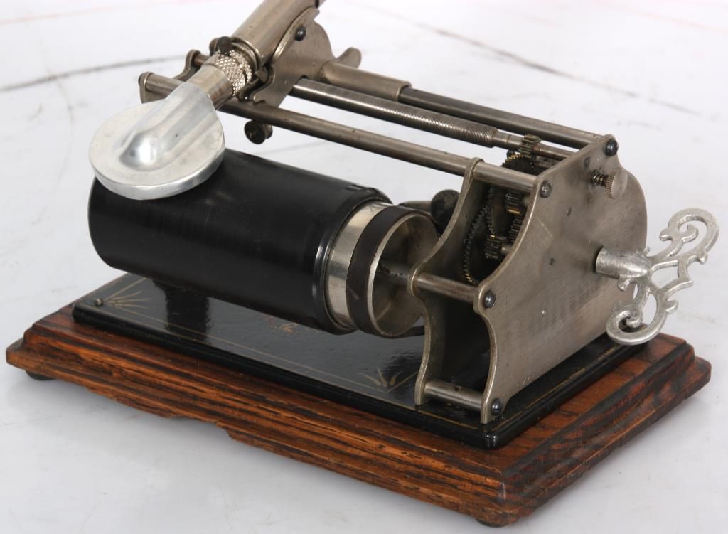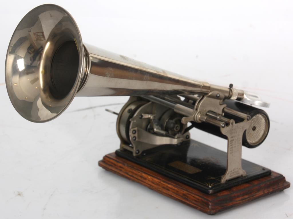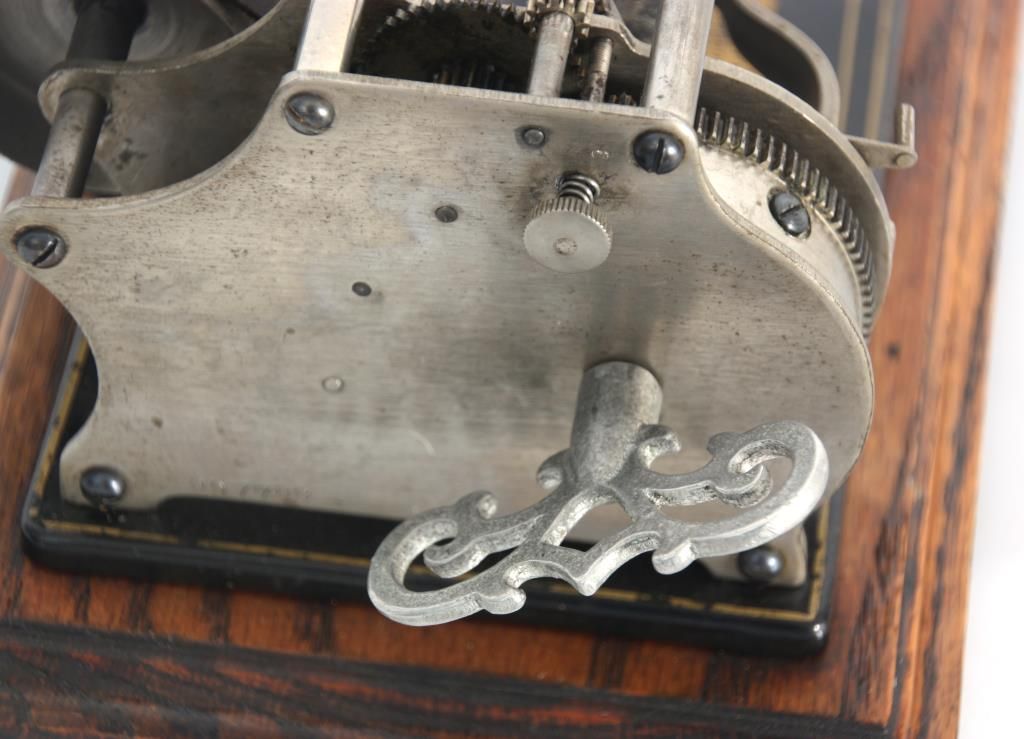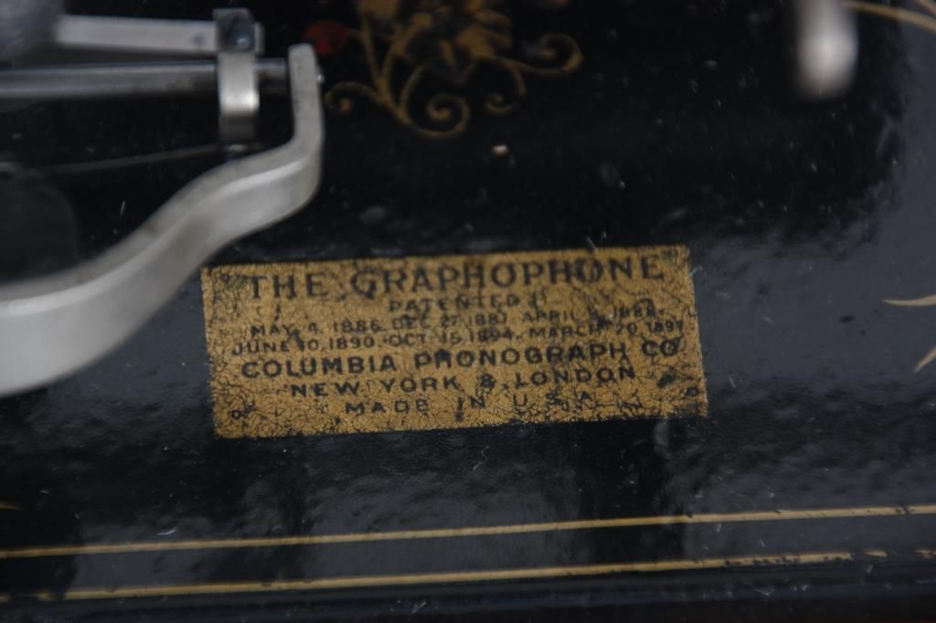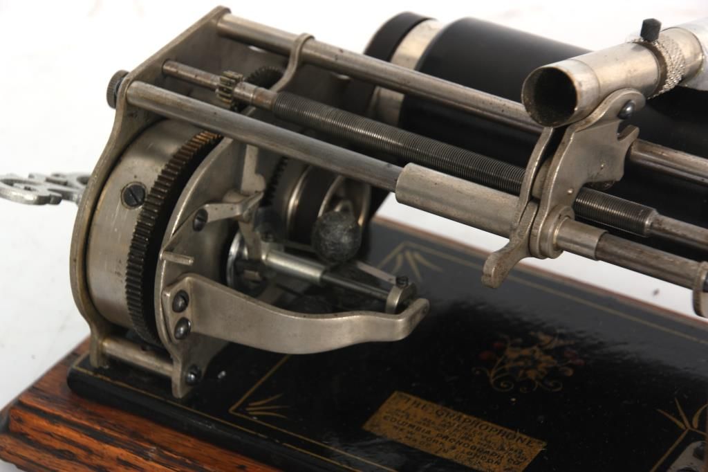 Columbia Phonograph Type Q Graphophone. The skelotonized cylinder phonograph has an oak base with iron base plate, painted black, with gilt and floral stenciling and decal for The Graphophone, Columbia Phonograph Co. Spring driven mechanism has exposed steel plates and gears with pierced butterfly crank signed on the side of the plate The Graphophone, American Graphophone Company. Has a floating Cylinder Phonograph reproducer feeding into the silvered horn with bell shaped rim; 11 in. long x 5 in. dia. overall dimensions are 11.5 in. high x 15 in. wide x 9 in. deep.