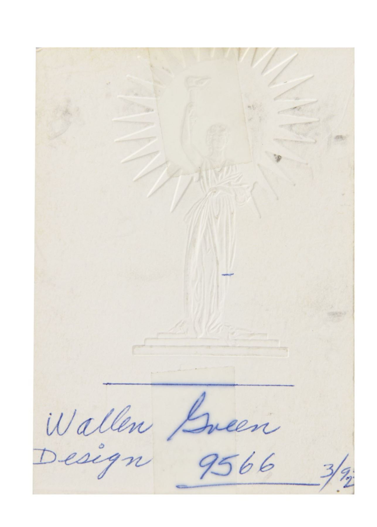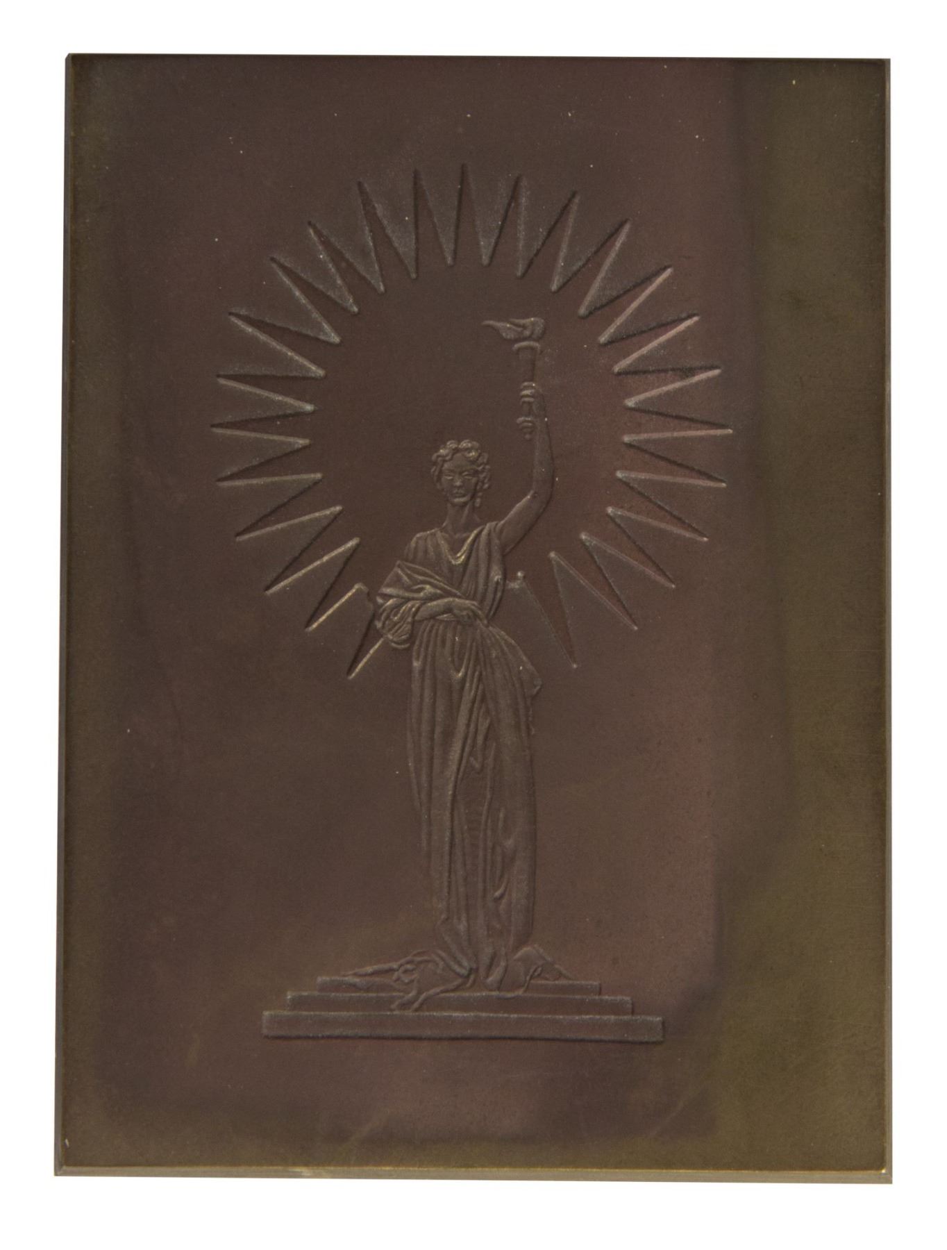 (Columbia Pictures, c.1970s-80s) A very rare and unique metal embossing plate featuring the iconic logo for Columbia Pictures. The plate features the slightly redesigned and familiar logo, and comes with a sample embossed sheet of paper. Measuring 4"x3", the embossing plate is in very good condition with some scuffing from use.
