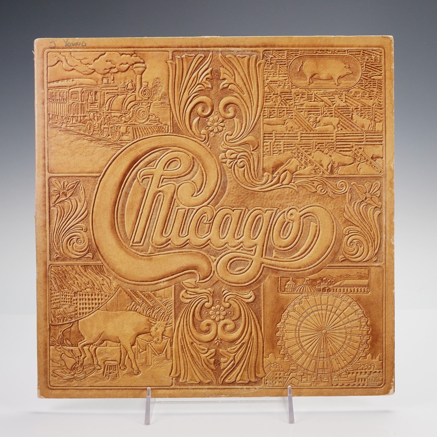 This 12-inch vinyl LP is the 1976 release "Chicago X" by the American rock band Chicago, issued by Columbia Records, playing at 33 1/2 revolutions per minute. The album is housed in a distinctive embossed gatefold cover designed, featuring ornate and stylized relief illustrations that depict scenes emblematic of Chicago's historical and industrial past, including livestock yards, railroads, a Ferris wheel, and pastoral iconography. The inner sleeve and center label replicate this intricate artwork, complementing the album's visual theme. "Chicago VII" includes singles like "Devil's Sweet", "Life Saver", "Wishing You Were Here", and much more.