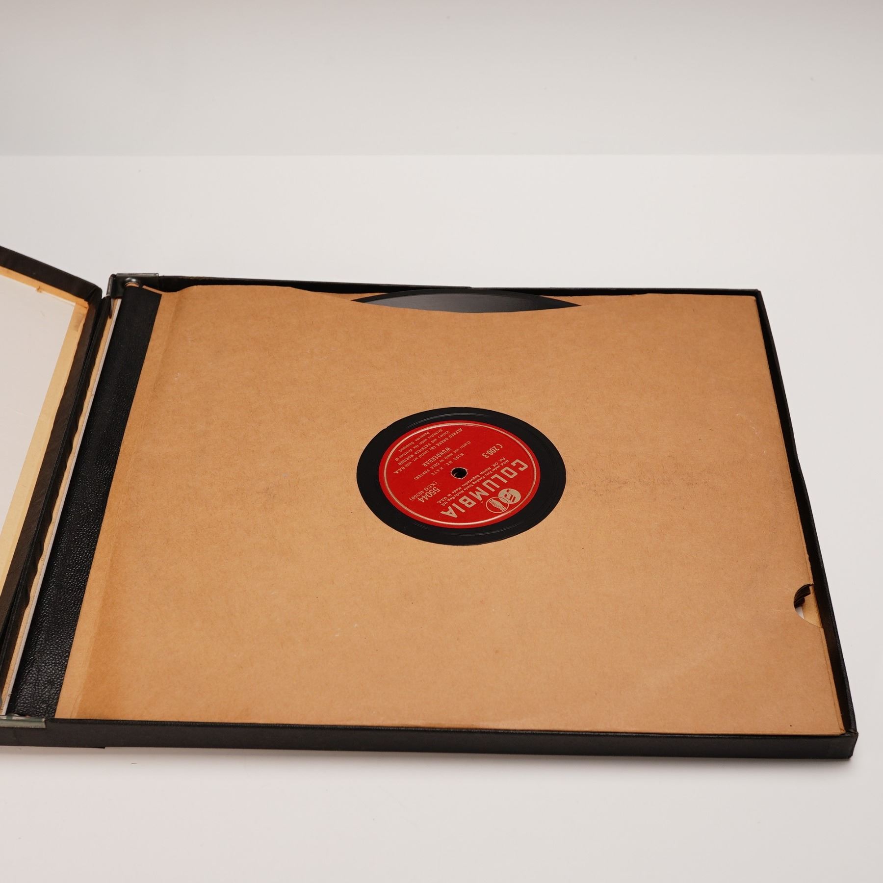 An original Columbia Records vinyl album set featuring the acclaimed 1948 Broadway production of Kiss Me, Kate with music and lyrics by Cole Porter. This deluxe release includes multiple 78 RPM records housed in a bound folio-style album with a bold Art Deco cover design in red, black, and yellow hues, featuring inset portraits of principal cast members Alfred Drake and Patricia Morison. The set presents the complete score performed by the original cast, accompanied by extensive liner notes, production stills, and contextual essays printed on the interior panels, offering historical insight into the show's staging and its place within the American theatrical canon. The orchestration was conducted by Pembroke Davenport with arrangements by Robert Russell Bennett. Columbia Records marked to front of case.