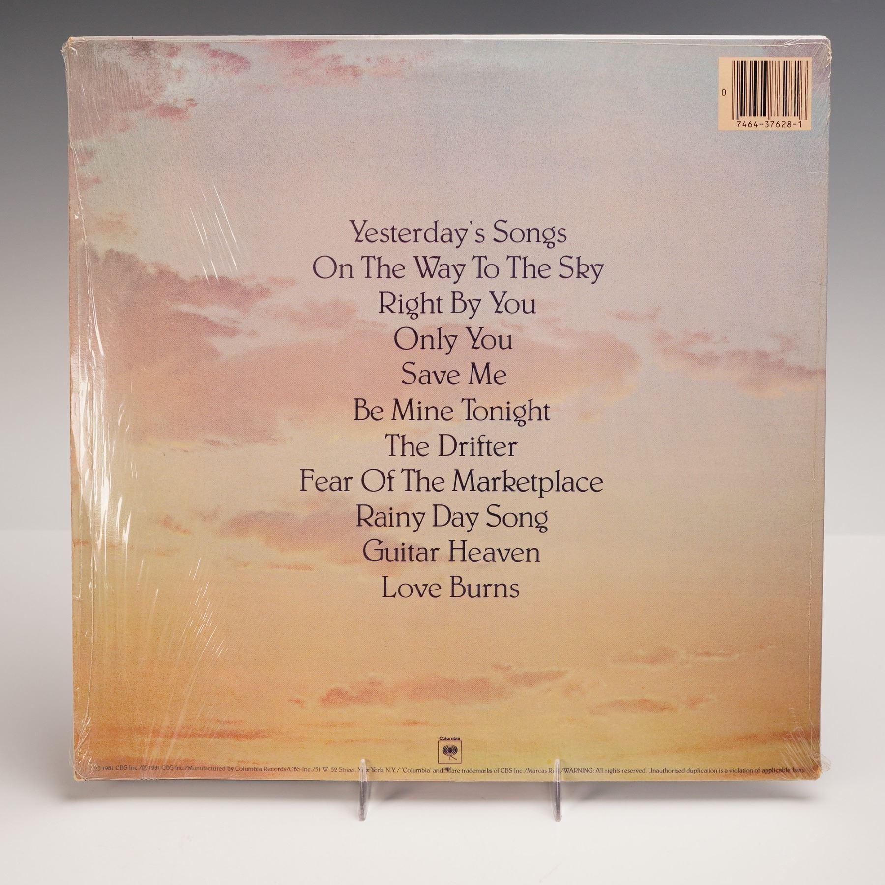 1981 U.S. pressing of On the Way to the Sky by Neil Diamond, issued by Columbia Records. This studio album is presented in a jacket adorned with a large photographic portrait of the artist on the front, with a subtle sky motif and full track listing elegantly arranged on the reverse against a gradient of pastel toned clouds. Songs include "Yesterday's Songs," "Right By You," "Only You," "Fear of the Marketplace," "Guitar Heaven," and the title track "On the Way to the Sky," Columbia Records label marked to reverse of jacket.