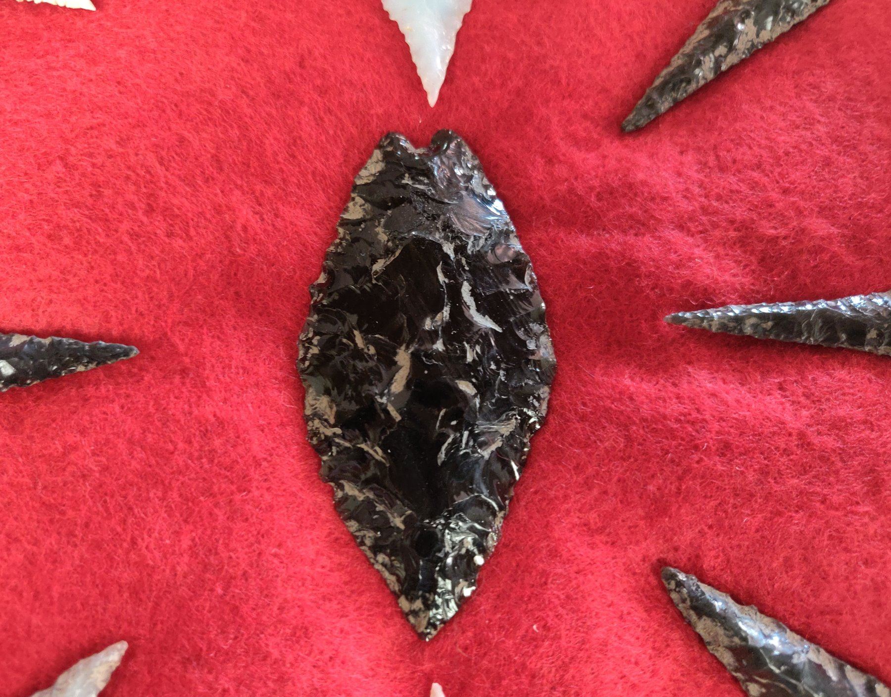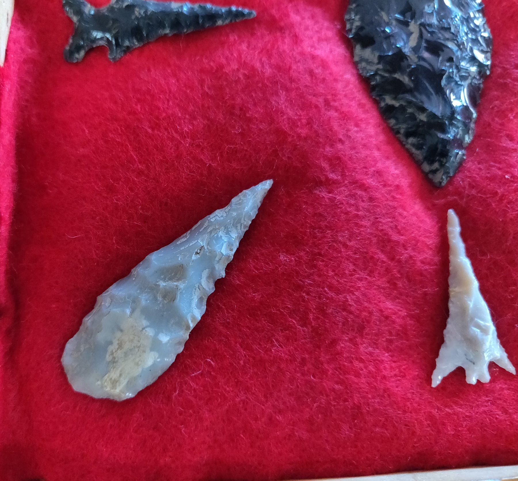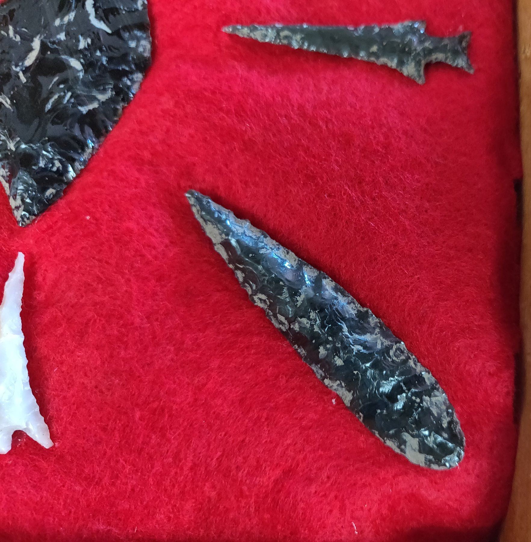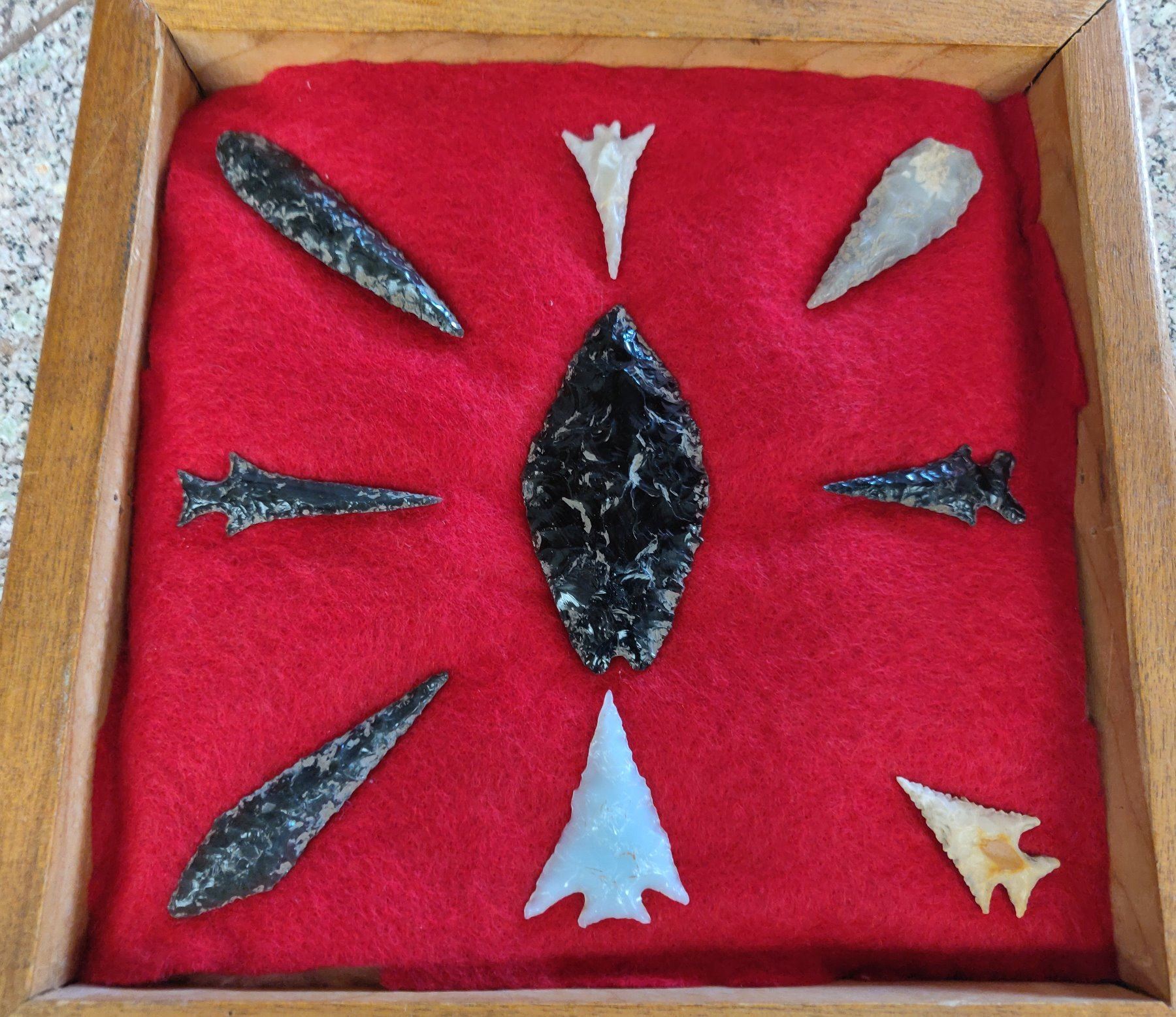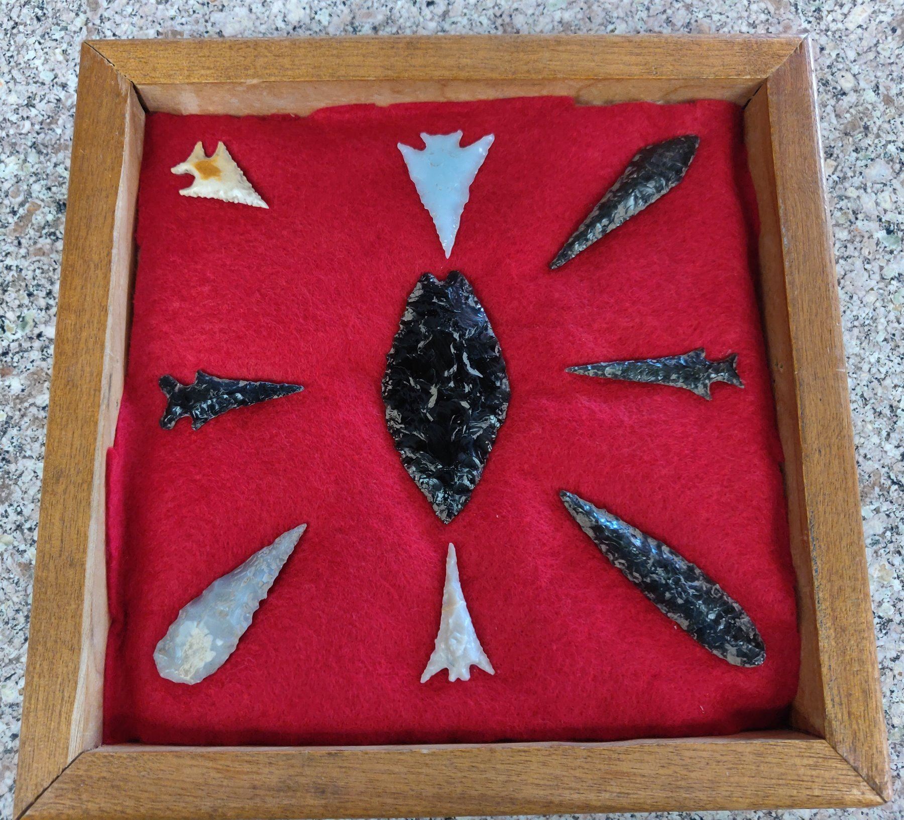 Columbia River Artifact Collection, pre-historic items. Made of opal, obsidian and chert, the longest item measures 2 3/4". Columbia River. Frame not included. Condition: As found, see images. Shipping: $20.00 w/insurance and signature.