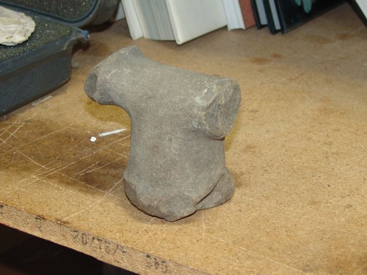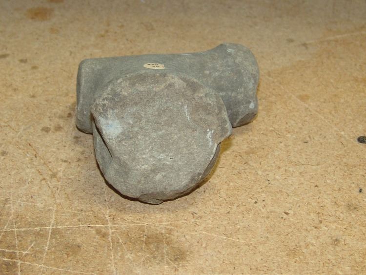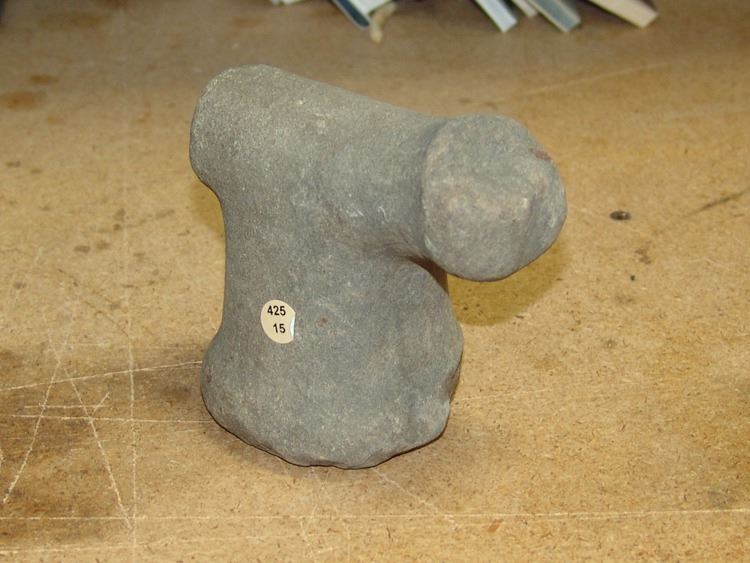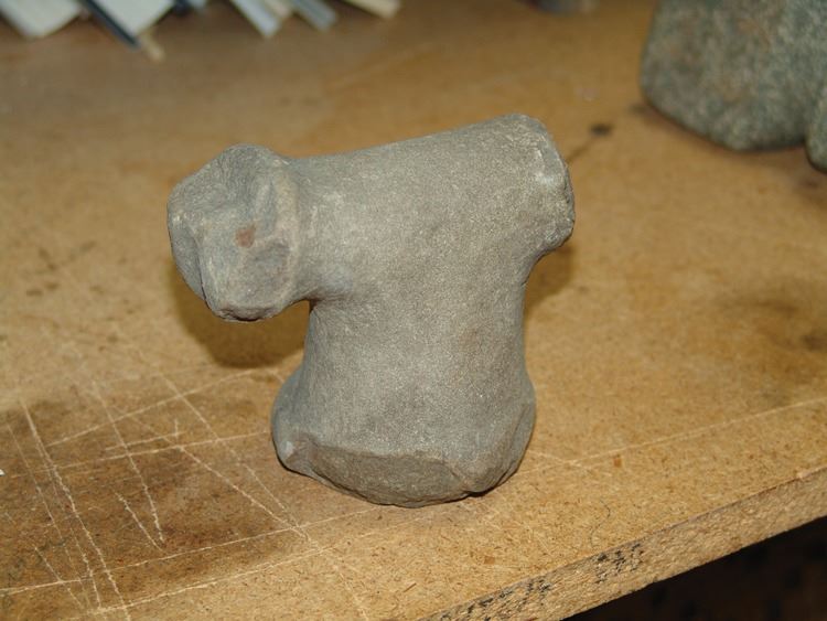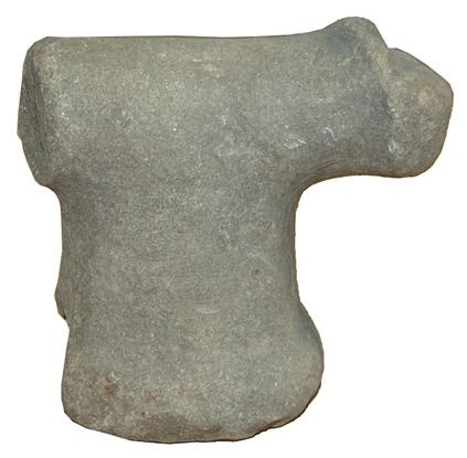 Very rare T-shaped carved stone bell pestle with barbed handle ends (one missing.) Shows much use. Found near Dalles, OR.,Pre Historic,4-1/4"