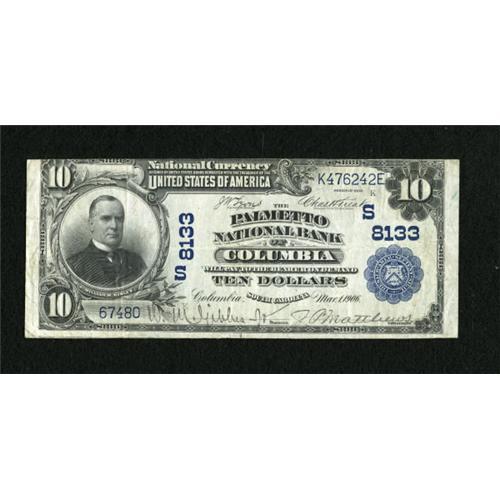 <B>Columbia, SC</B></I> - $10 1902 Plain Back Fr. 625 <B>The Palmetto NB</B></I> Ch. # (S)8133<BR> A solid piece with bright paper. <B>Fine-Very Fine.</B></I><BR><BR><b>Shipping:</b> Coins & Currency (<a target="_blank" href="http://www.heritageauctions.com/common/shipping.php">view shipping information</a>)