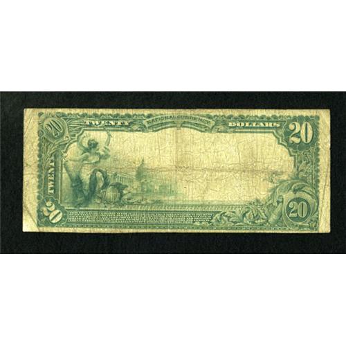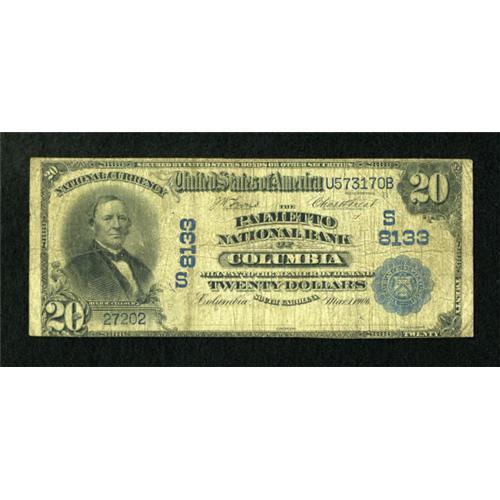 <B>Columbia, SC</B></I> - $20 1902 Plain Back Fr. 651 <B>The Palmetto NB</B></I> Ch. # (S)8133<BR> This capital city bank carries the perfect title for an institution located in the Palmetto State. Large size only from this bank that lasted only 17 years before closing in 1923. The signatures are long gone on this well circulated <B>Very Good</B></I> example.<BR><BR><b>Shipping:</b> Coins & Currency (<a target="_blank" href="http://www.heritageauctions.com/common/shipping.php">view shipping information</a>)