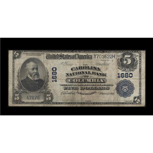 <B>Columbia, SC</B></I> - $5 1902 Plain Back Fr. 600 <B>The Carolina NB </B></I> Ch. # 1680<BR>This capital note retains all its pieces, but is lightly toned and exhibits some foxing on the back. <B>Fine.</B></I>