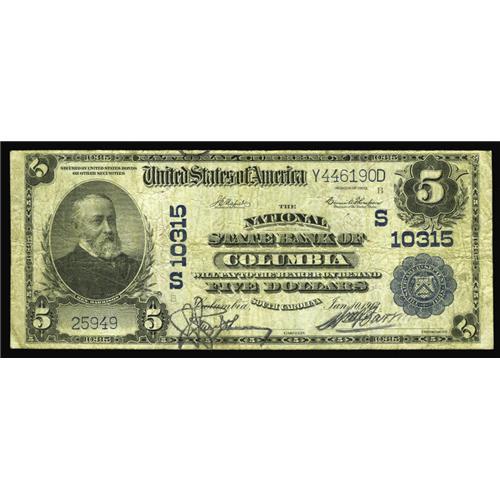 <B>Columbia, SC</B></I> - $5 1902 Plain Back Fr. 603 <B>The National State Bank </B></I> Ch. # (S)10315<BR>Two pinholes are noted on this piece which is otherwise fully original and quite attractive. The margins are healthy and free of splits. <B>Fine.</B></I>