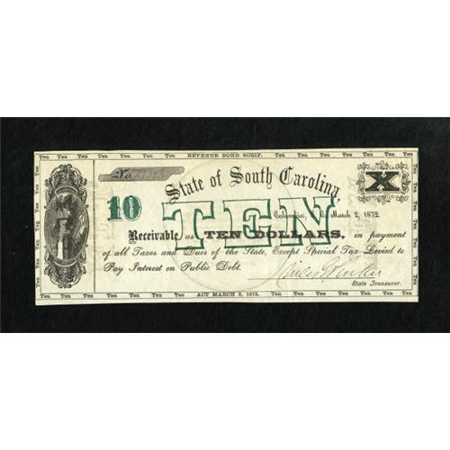 <B>Columbia, SC- State of South Carolina</B></I> $10 March 2, 1872.<BR> Strong embossing is a trait of this issue. <B>Crisp Uncirculated.</B></I><BR><BR><b>Shipping:</b> Coins & Currency (<a target="_blank" href="http://www.heritageauctions.com/common/shipping.php">view shipping information</a>)