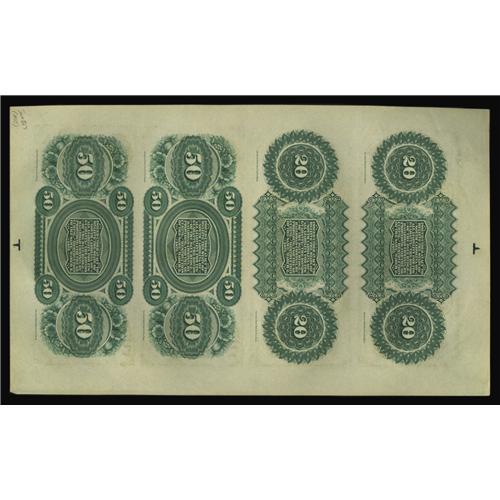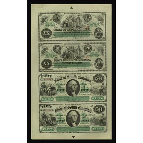 <B>Columbia, SC-State of South Carolina</B></I> $20-$20-$50-$50 March 2, 1872 Cr.7-7-8-8 Sheheen 14-14-15-15 Uncut Sheet<BR>These gorgeous sheets just don't appear in sales as much anymore, most likely being cut up into singles. <B>Choice Crisp Uncirculated.</B></I>