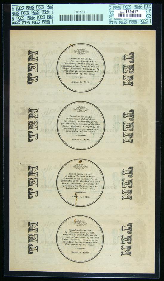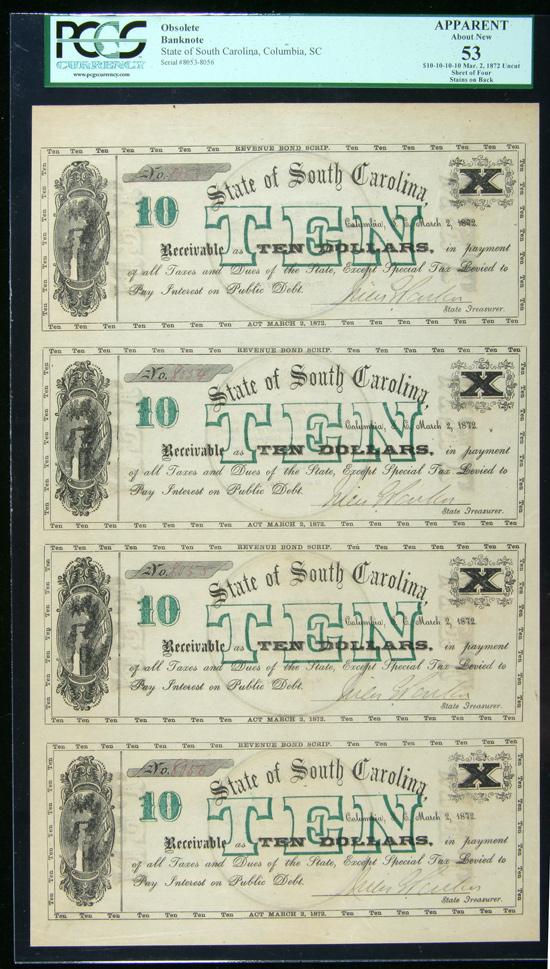 Columbia, SC. State of South Carolina. Cr. 2 March 2, 1872 $10-10-10-10 Uncut Sheet. PCGS Currency Apparent About New 53. This sheet of $10s appears pristine from the face, although the numeric grade is limited by some bends in the paper and an Apparent grade was assigned due to some minor staining on the back.
