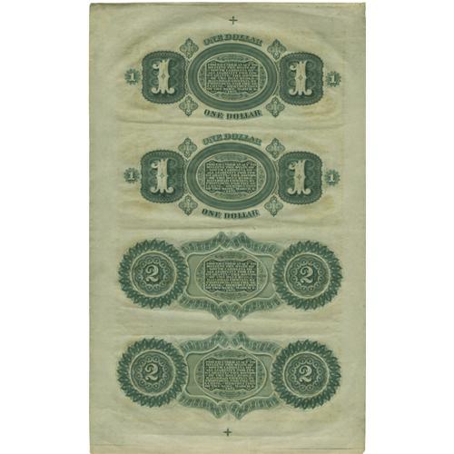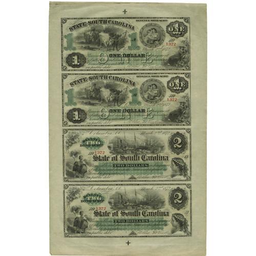 <B>Columbia, SC- State of South Carolina</B></I> $1-$1-$2-$2 Mar. 2, 1872 Sheheen 10-10-11-11 Uncut Sheet<BR> This ABNCo printed uncut sheet shows light handling and full selvage. Many of these sheets have been cut in recent years in order to satisfy the demand for individual notes. This has caused the uncut sheets to become scarce in their own right. <B>Extremely Fine.</B></I><BR><BR><b>Shipping:</b> Coins & Currency (<a target="_blank" href="http://www.heritageauctions.com/common/shipping.php">view shipping information</a>)