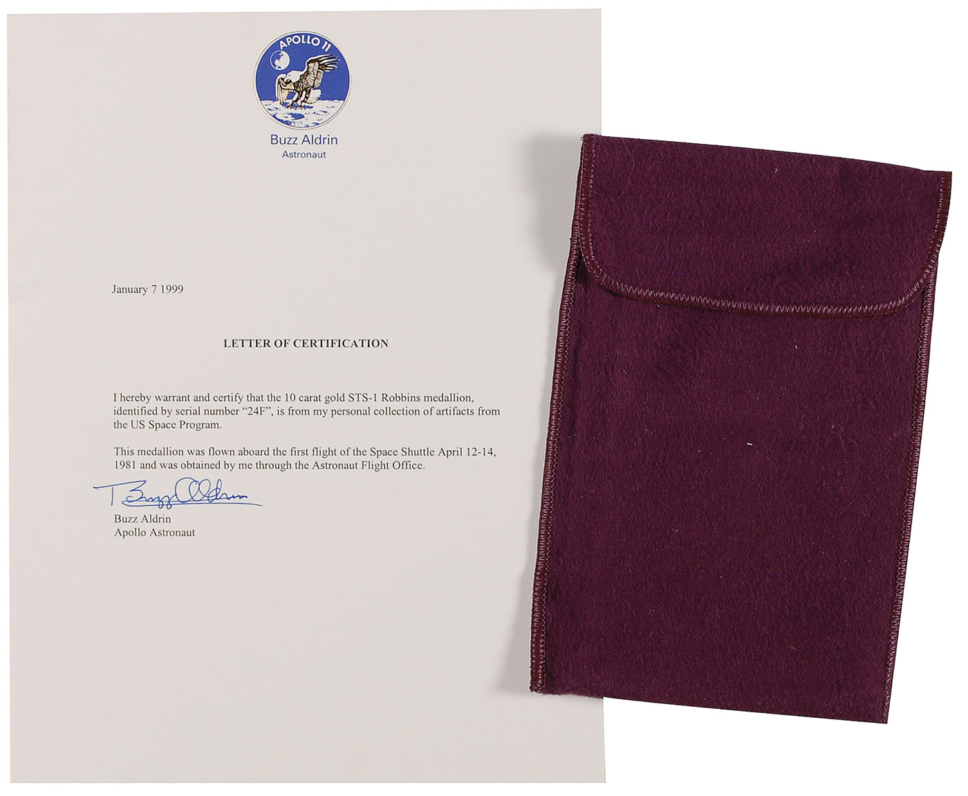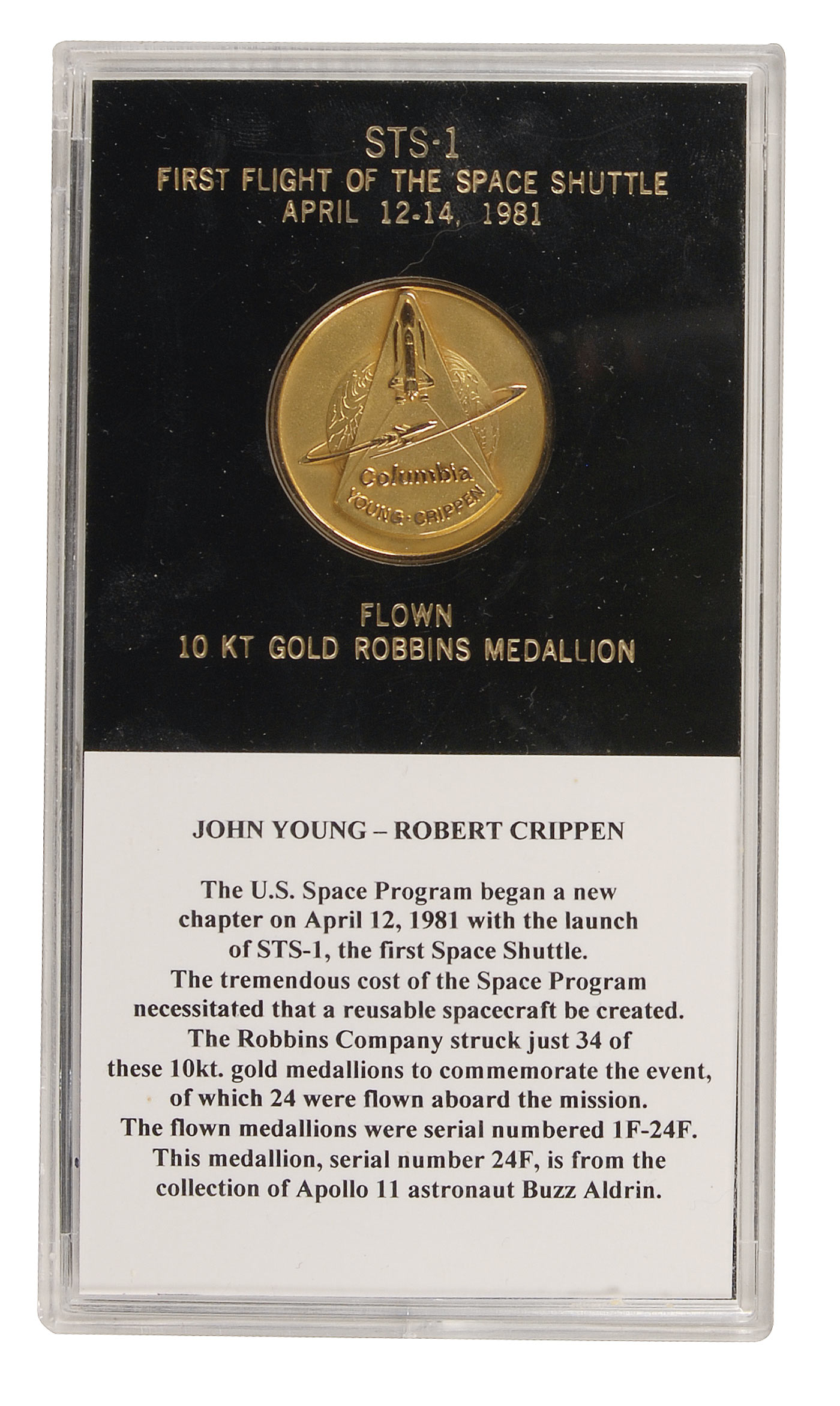 Flight-flown 10-karat gold Space Shuttle Columbia STS-1 Robbins Medal, approximately 1.5-inch diameter, with a raised design on the face of the mission insignia, and the mission and astronauts’ names. The reverse of the medal is engraved with the launch and re-entry dates, as well as the names of astronauts John Young and Robert Crippen. Encapsulated within a clear plastic case. Serial numbered “24 F” around the rim. Normal condition. Accompanied by a letter of authenticity from Buzz Aldrin that reads in part: “This medallion was flown aboard the first flight of the Space Shuttle April 12–14, 1981 and was obtained by me through the Astronaut Flight Office.” STS-1 was the first orbital flight of the shuttle, launched on April 12, 1981, and returning to Earth two days later.