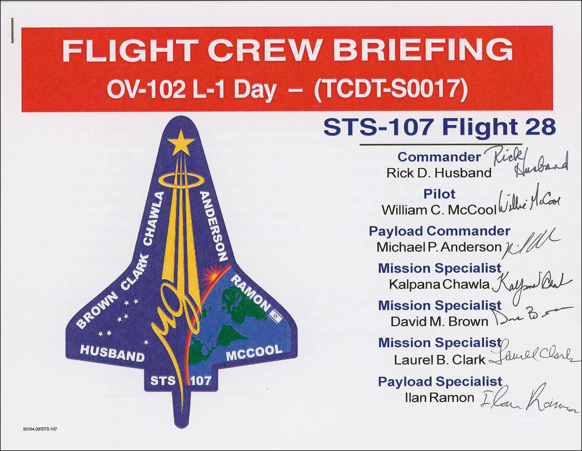 Crew briefing color laser print agenda for Space Shuttle Columbia (STS 107), 11 x 8.5, 28 pages, issued the day before launch of the doomed 2003 flight. Signed in black felt tip or ballpoint by the complete crew next to their respective printed name on the cover page: Rick D. Husband, William McCool, Dave Brown, Kalpana Chawla, Michael Anderson, Laurel B. Clark, and Ilan Ramon. In very fine condition with a staple at the top left corner. Columbia disintegrated during re-entry into Earth's atmosphere on February 1, 2003, resulting in the death of all seven crew members.