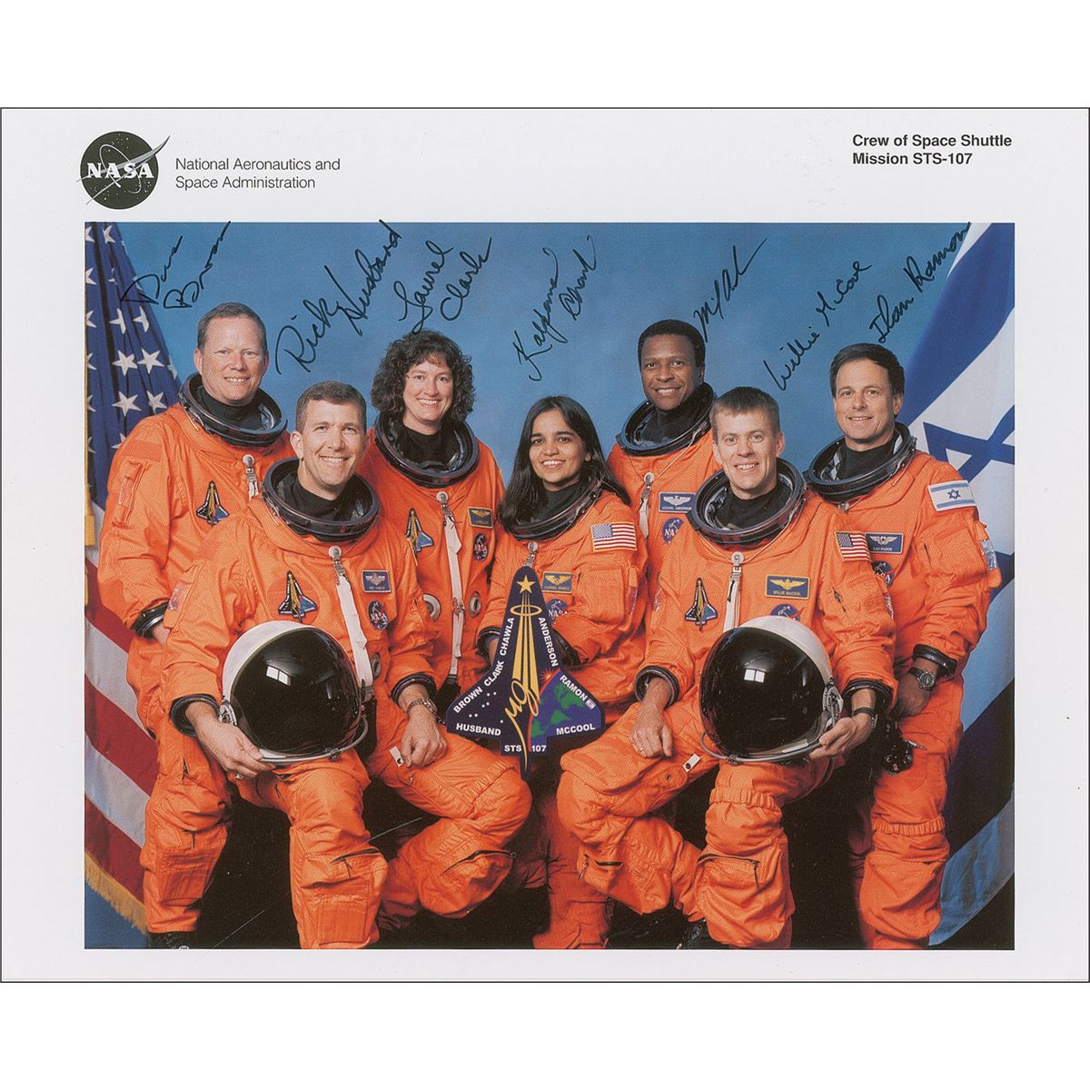 Color 10 x 8 NASA photo of the doomed crew of the space shuttle Columbia, signed in black felt tip by Rick Husband, Willie McCool, Michael Anderson, Kalpana Chawla, David Brown, Laurel Clark, and Ilan Ramon. In fine condition with a few light bends. A wonderful signed example of these American heroes.