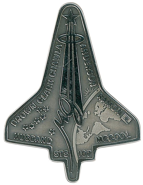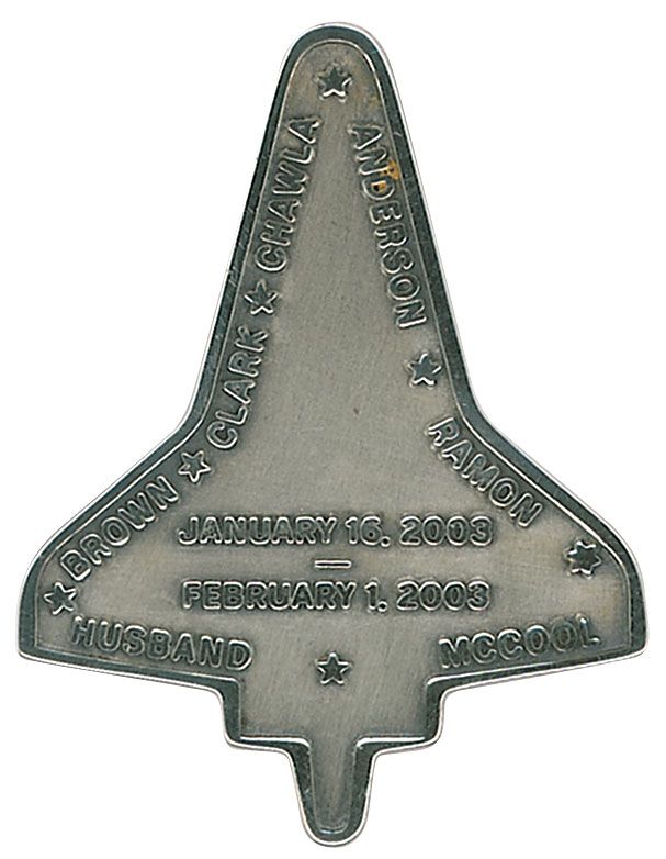 Space Shuttle Columbia STS-107 Robbins Medal, approximately 1.5 x 2 with a raised design on the face of the mission insignia, and the mission and astronauts’ names. The reverse of the obviously unflown sterling silver medal is engraved with the January 16, 2003, launch date; February 1, 2003, re-entry date; and the names of the astronauts who perished. Serial numbered “293” around the edge. Medal comes in its original case. In very fine condition.
