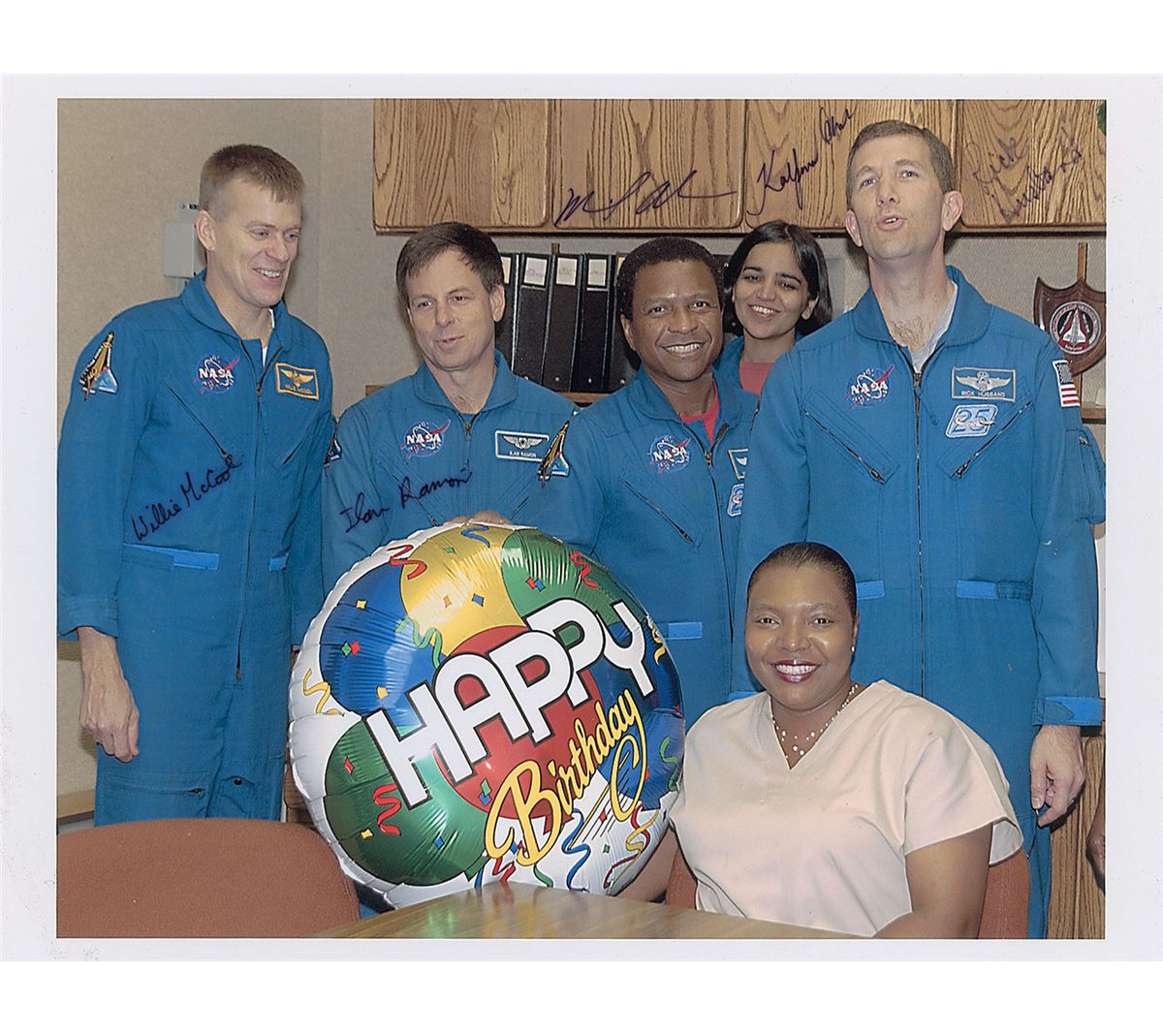 Color glossy 11 x 8.5 ink jet photo of the Columbia crew posing together at an office birthday party, signed in black felt tip by five crew members: Rick Husband, Willie McCool, Michael Anderson, Kalpana Chawla, and Ilan Ramon. In fine condition, with a slightly hazy appearance to signatures due to nature of the paper.