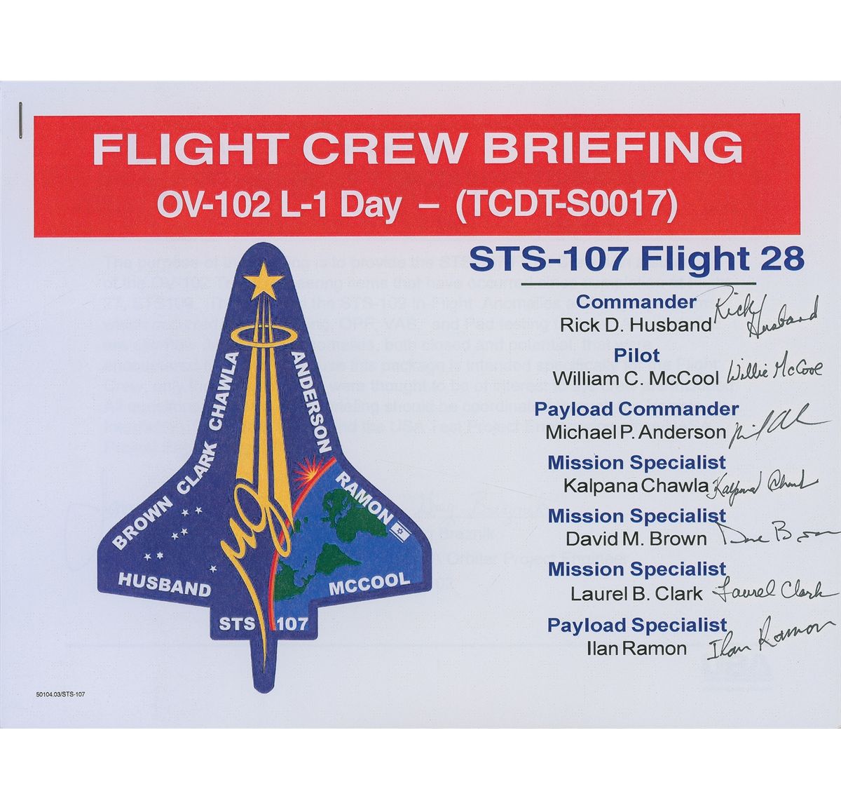 Flight crew briefing for Space Shuttle Columbia (STS 107), 11 x 8.5, 28 pages, headed “OV-102 L-1 Day.” Introduction states that the briefing includes “STS-109 in-flight anomalies and major problems which occurred during landing.” Signed in black felt tip or ballpoint by the complete crew next to their printed names on the cover page: Rick Husband, Willie McCool, Dave Brown, Kalpana Chawla, Michael Anderson, Laurel Clark, and Ilan Ramon. In fine condition with a staple at the top left corner and very subtle haloing to ink. Fewer than 100 of these booklets were produced for the briefing held at Kennedy Space Center prior to the terminal countdown demonstration test (TCDT). For this event, the crew flew in from Houston to the Kennedy Space Center for a full dress rehearsal. This briefing is one of the first scheduled crew events to take place during this two-to-three day TCDT.