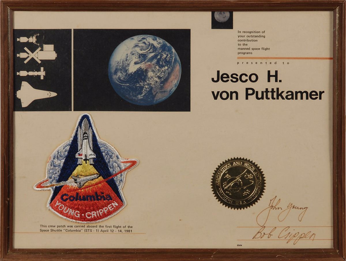 Flown embroidered STS-1 mission patch, 4.25 x 4.75, carried on board the first flight of the Space Shuttle Columbia from April 12–14, 1981. Patch is affixed to a 13 x 10 certificate presented to Jesco H. von Puttkamer, “in recognition of your outstanding contribution to the manned space flight programs.” Lower right bears autopen signatures of astronauts John Young and Bob Crippen, as well as a gold NASA seal. Framed and in fine condition, with some light foxing to the mount. Von Puttkamer was a renowned aerospace engineer and senior NASA manager who worked alongside Wernher von Baun on the Apollo program and as a consultant to Gene Roddenberry for the first Star Trek film.