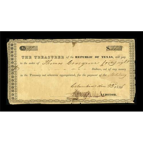 <B>Columbia, TX- Republic of Texas Third Issue Warrant</B></I> $48.00 Dec. 22, 1836 Cr. C-5A, Medlar 5, Olson 212<BR> This cataloger has referenced a variety of Republic of Texas sites to form an opinion on who or what exactly is Thomas' last name on this warrant, using both the front and the back endorsement, but, to no avail (and yes, I tried searching through all of the Thomas' as well). Multiple small edge splits are noted around the perimeter of the paper, a light stain is noted at right, and some paper separation is noted along the center horizontal fold. <B>Fine</B></I>.<BR><BR><b>Shipping:</b> Coins & Currency (<a target="_blank" href="http://www.heritageauctions.com/common/shipping.php">view shipping information</a>)