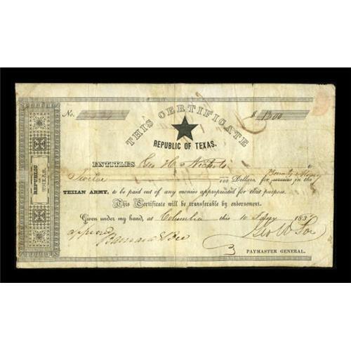 <B>Columbia, TX- Republic of Texas Third Issue Warrant</B></I> $12.00 Jan. 10, 1837 Cr. C-16A, Medlar UNL, Olson 264<BR> An ornate issue with a single black five-pointed star in the center at top, a Texian Army "Bounty Money" warrant made out to George Nichols, who has also endorsed the back. A very rare design type, certain to command much interest due to its "Lone Star" design. <B>Very Fine</B></I>, with tape reinforcements along the vertical and horizontal folds on back. Also note that John Brimley has made is mark on back, along with two other illegible names.<BR><BR><b>Shipping:</b> Coins & Currency (<a target="_blank" href="http://www.heritageauctions.com/common/shipping.php">view shipping information</a>)