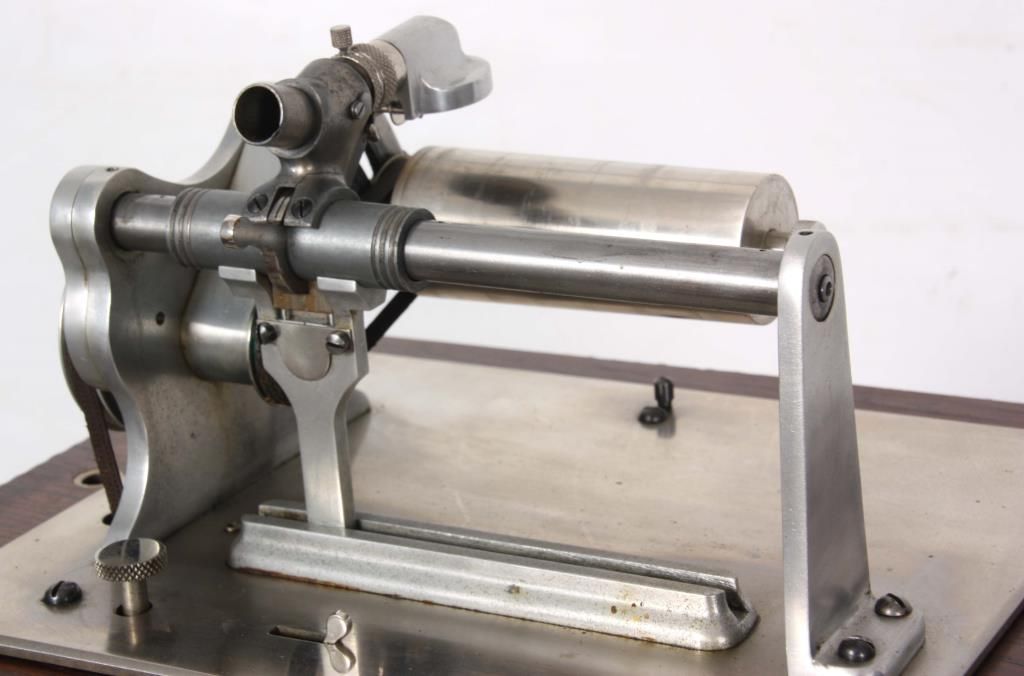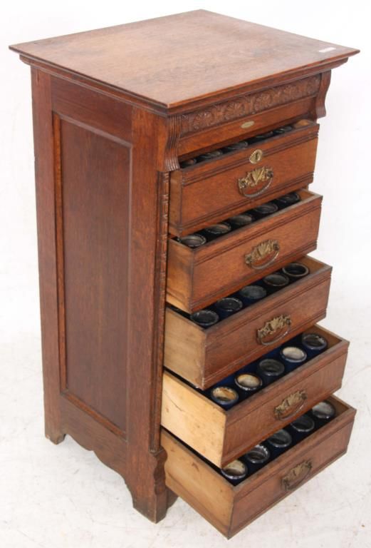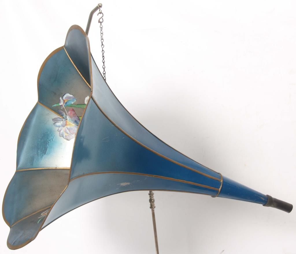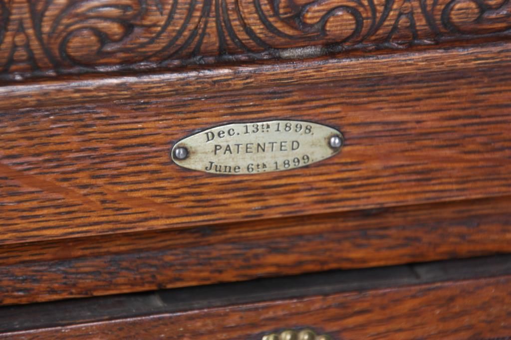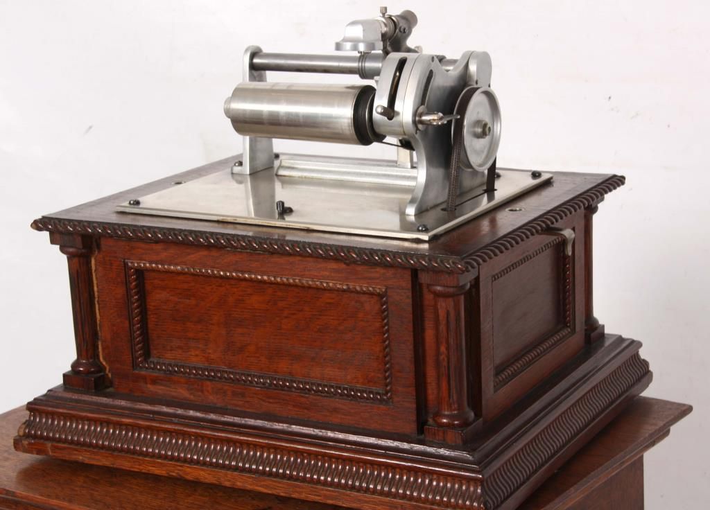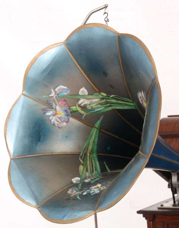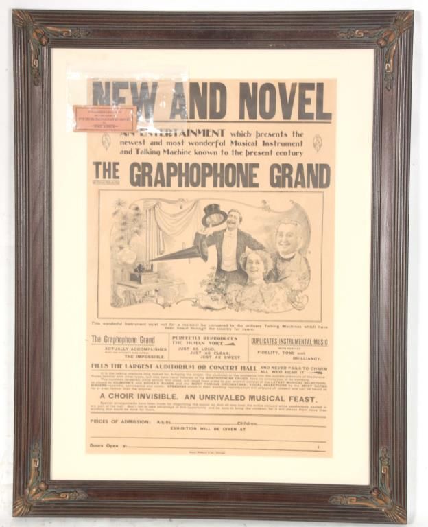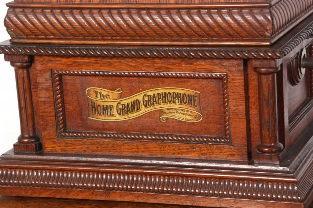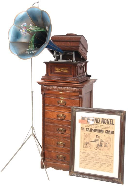 Columbia Type AD Home Grand Graphophone On Stand. The graphophone has an oak case with fancy domed lid, turned handle on top, rope twisted carved trim, turned corner columns and inset panels with The Home Grand Graphophone gold banner on the front. Has a nickeled base plate and structure with aluminum floating reproducer. This is a very rare model having a 2 in. dia. mandrel playing the standard cylinder records, slip-on 3 in. mandrel sleeve to play the saloon style cylinders and a large slip-on 5 in. dia. mandrel sleeve playing the concert cylinder records; the mandrel is on a pivoting bracket allowing the distance from the reproducer to be adjusted according to the cylinder diameter. Has a beautiful 8 panel horn with blue iridescent finish, gilt painted ribs and hand painted blue iris’ inside of the bell, measures 30 in. long x 19 in. dia.; hangs on a floor standing nickel plated tripod crane standing next to the floor cabinet. The phonograph sits on an oak 5 drawer cabinet with front, pilasters and serpentine kick board, has brass pulls and nickel name plate which reads “Patented, Dec. 13th 1898, June 6th 1899”. The cabinet holds 100 standard sized records and is accompanied by various Concert and Saloon records. Finally, this lot is complete with a framed poster pin-up advertising a concert, using the Home Grand Graphophone with 4 original brown paper admission tickets to the concert. Case measures 16 in. high x 16.5 in. wide x 13.75 in. deep; 5 drawer stand measures 36.5 in. high x 20.5 in. wide x 17 in. deep.