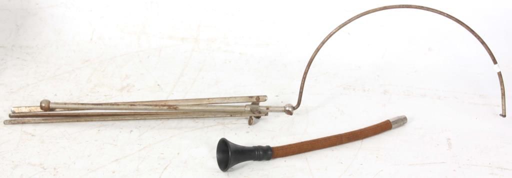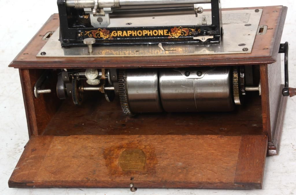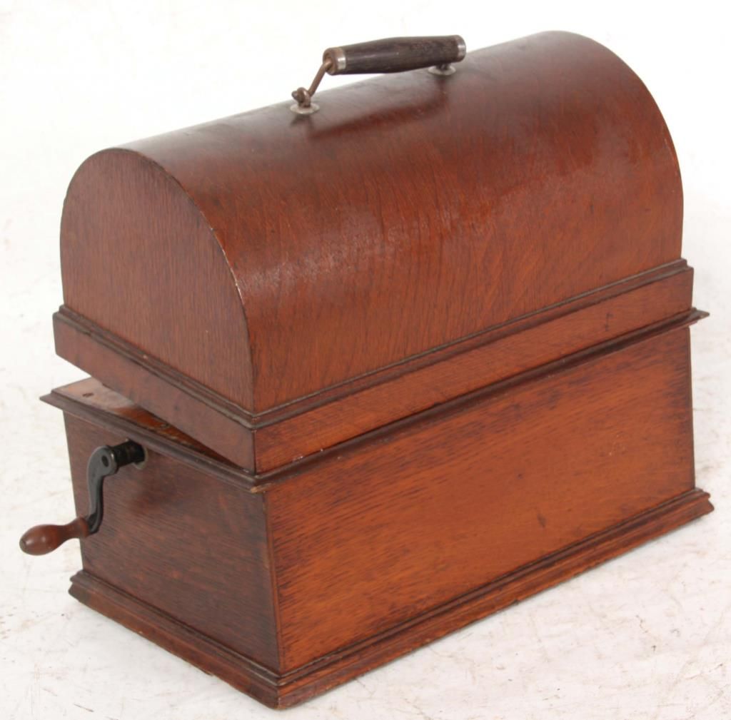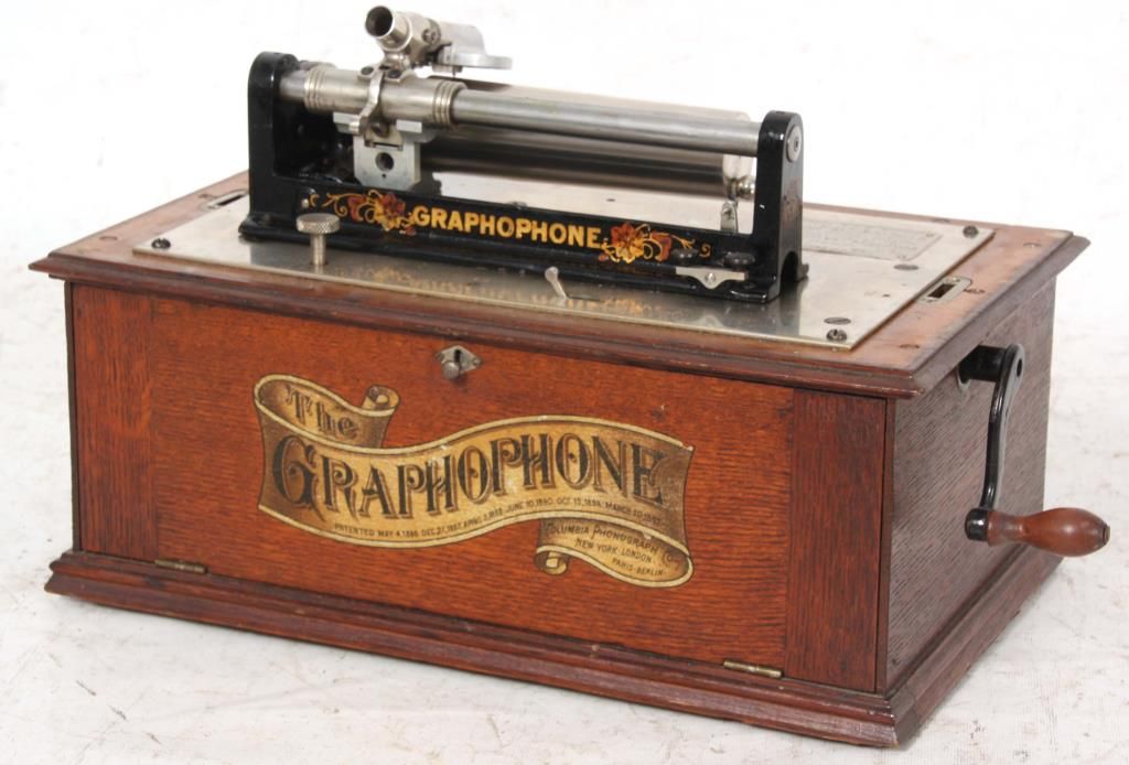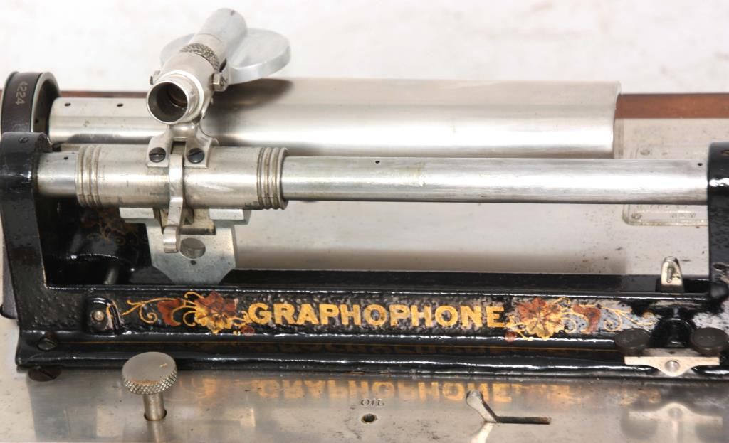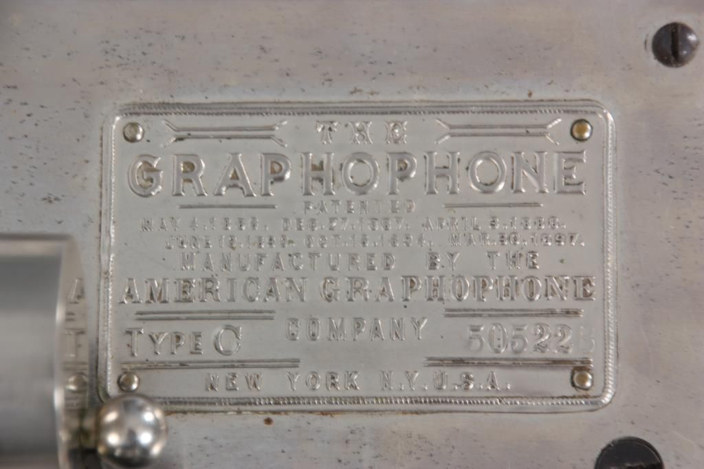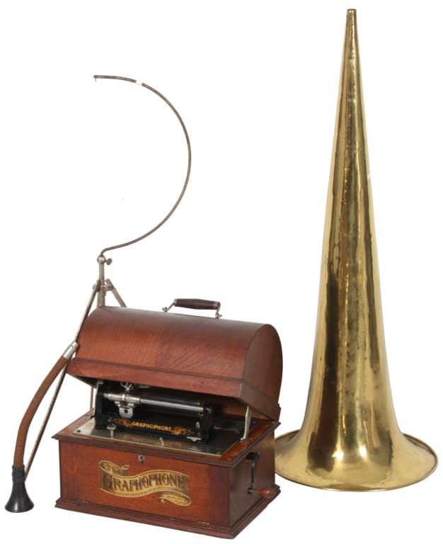 Columbia Type C Cylinder Phonograph. Oak case has a drop front panel with “The Graphophone” banner decal and a domed lid; nickel plated base plate, black painted chassis with gilt stenciling and red filigree decoration, aluminum “floating eagle” reproducer, signed on a metal tag “The Graphophone” type C and serial number 505228. Has a tripod crane with large brass horn measuring 40.5 in. long x 15 in. dia; speaking tube has a black hard rubber mouthpiece with rubber tubing and woven cover in good condition. Case is 14 in. high x 16.5 in. wide x 10 in. deep.
