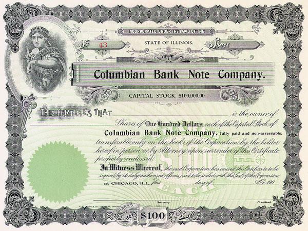 190 , Illinois. Unissued stock certificate. Gray/Black with green overprint and green seal. Vignette of bust of allegorical figure at top left. Extremely fine
