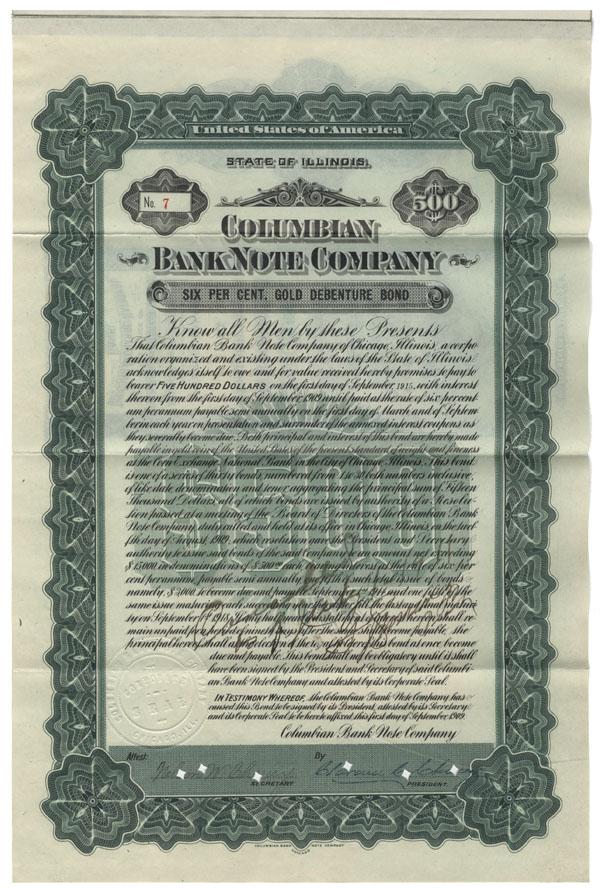 1909, Illinois. $500 bond bearing 6% interest. Green/Black. An extremely scarce bond from this bank note company. Uncancelled and Fine.