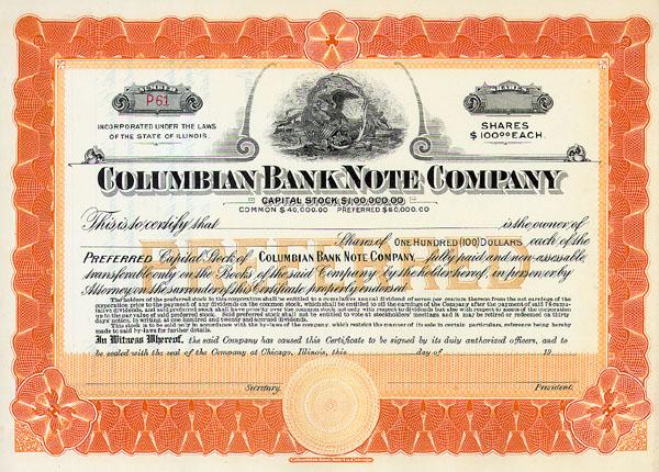 19 , Illinois. Unissued stock certificate. Orange/Black with orange overlay. Vignette at top center of state seal. Very fine.