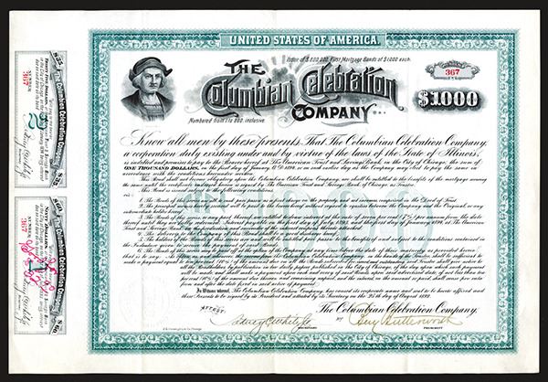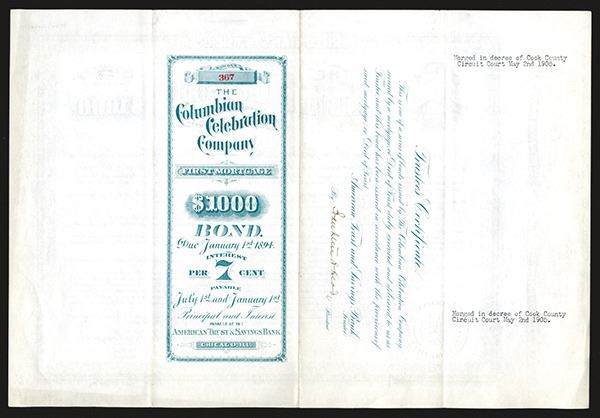 Illinois. $1000 Coupon Bond. Issued. With handwritten coupon revaluation and 1905 typed statement on back margin. Historic World's Fair financing document.