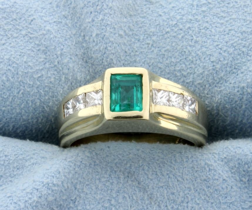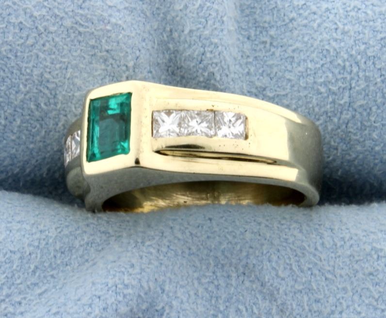 14K yellow gold, the 5.5x4.5mm natural Columbian emerald has exceptional clarity & color! Contains six .1ct princess cut diamonds, VS clarity, F color. Size 6 1/4 8.3g