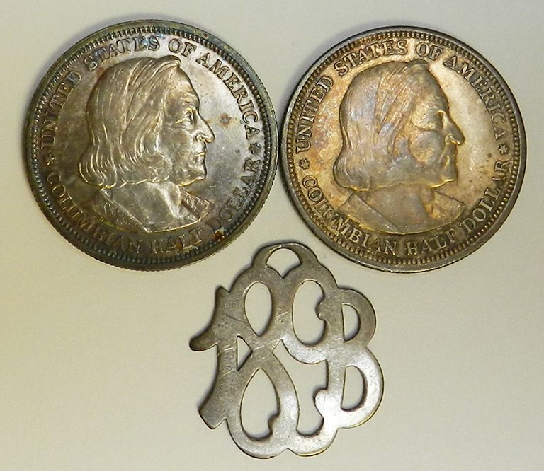 Columbian Exposition, 1892 and 1893. One each date, avg toned AU. Also, an ornate hand carved scroll work “1893” drop crafted from a similar Columbian Expo Half Dollar, VF. 3 pcs.