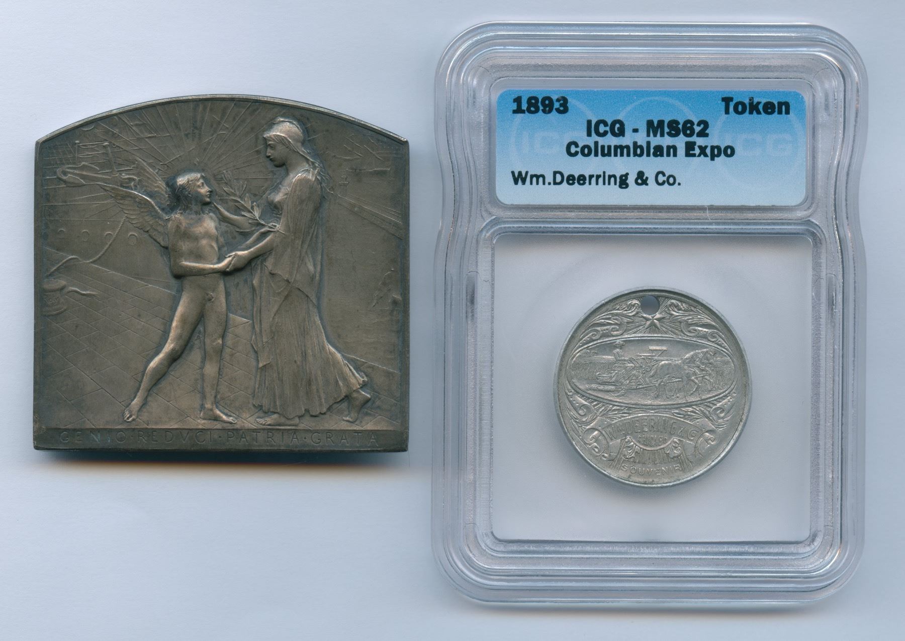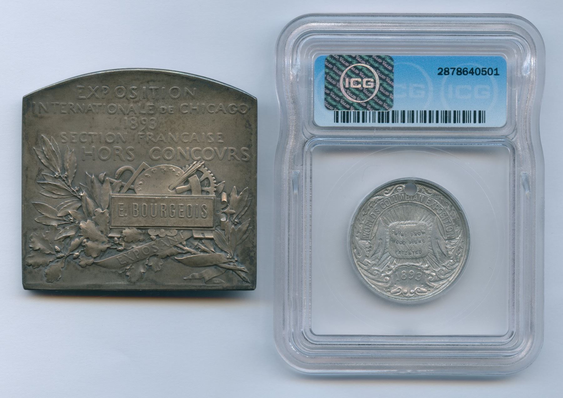 Includes: 1.) Columbian Expo William Deering & Co. Aluminium Token, ICG MS62, 28mm, Eglit-5. 2.) Columbian Expo French Award medal, silver-plated bronze, 53mm x 50mm, Eglit-234. 2 pcs.