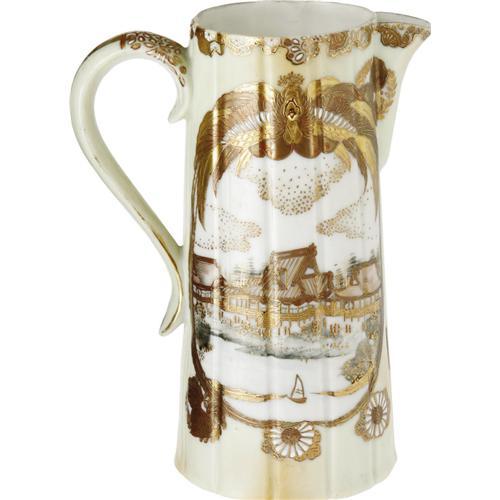 <B>Columbian Exposition Satsuma Pitcher.</B></I> Traditionally an isolationist kingdom, Japan had entered the modern world by the late 19th century and was an eager participant in Chicago's Columbian Exposition of 1892-93. This exquisite Satsuma one-handled pitcher was made in Japan for sale in America as a souvenir of the exposition. One side shows Machinery Hall while the other has the expo's Japanese building. As is typical of Satsuma, this pitcher has gilt highlights and a creme outer glaze. Signed in Japanese on the base in a blue underglaze. A hairline to the underside and a small amount of wear to the gilt on the handle, else very fine condition. 7.25" high.