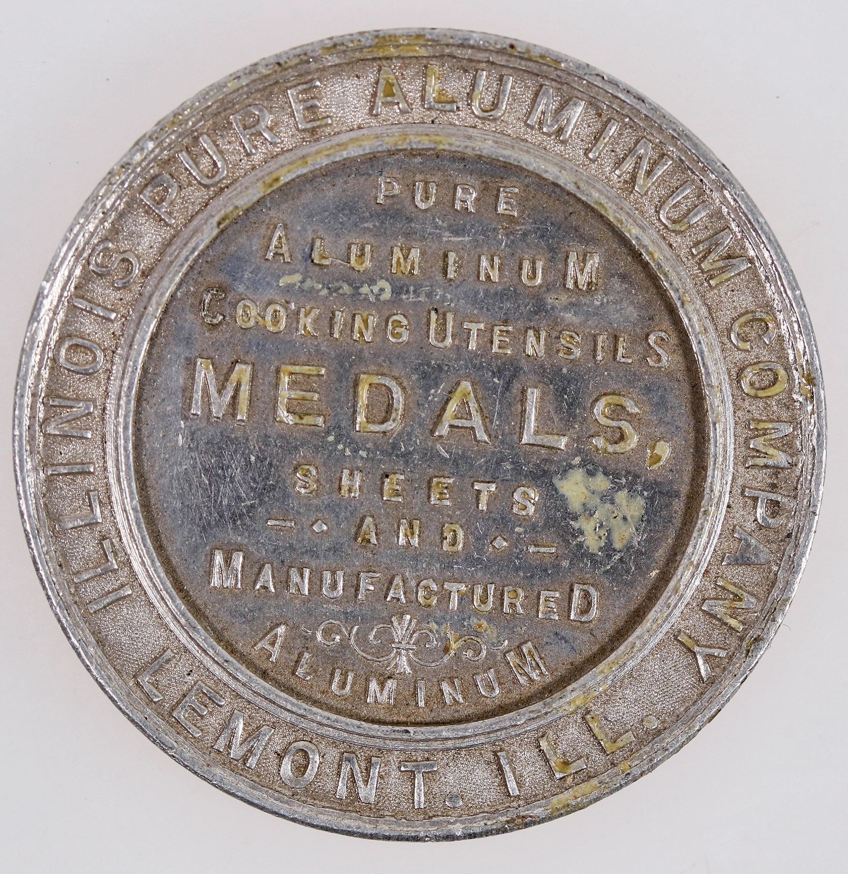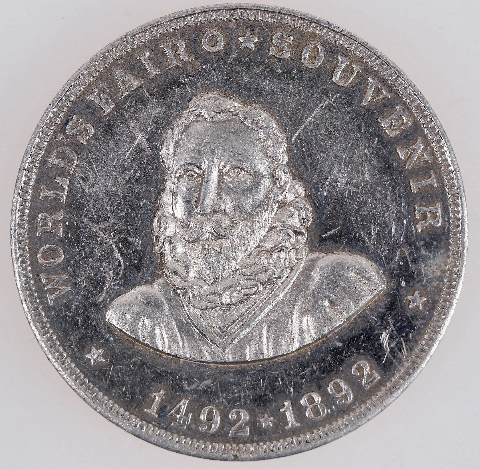 Obv.: World's Fair Souvenir / (Columbus portrait) / 1492-1892; Rev.: Illinois Pure Aluminum Company / Lemont, Ill. / Pure / Aluminum / Cooking Utensils / Medals / Sheets / And / Manufactured / Aluminum. Al., rd., 35 mm.