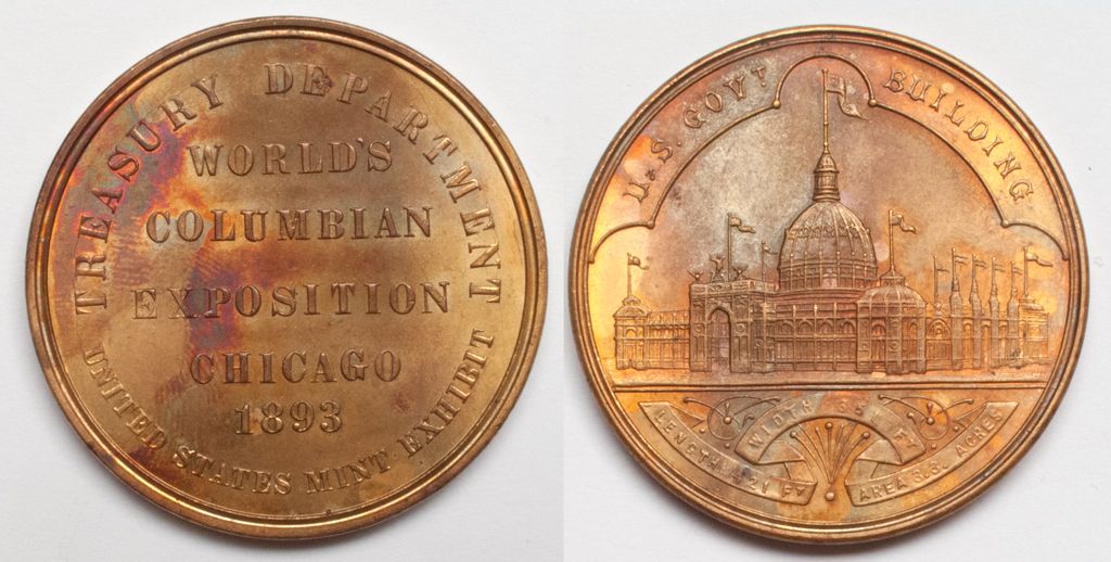Brilliant Uncirculated 1893 Columbian Exposition medallion from Chicago. Obverse has a picture of the United State Government building. Reverse says, "Treasury Department, United States Treasury, Worlds Columbian Exposition, Chicago, 1893. R-2City: ChicagoCounty: State: ILDate: 1893
