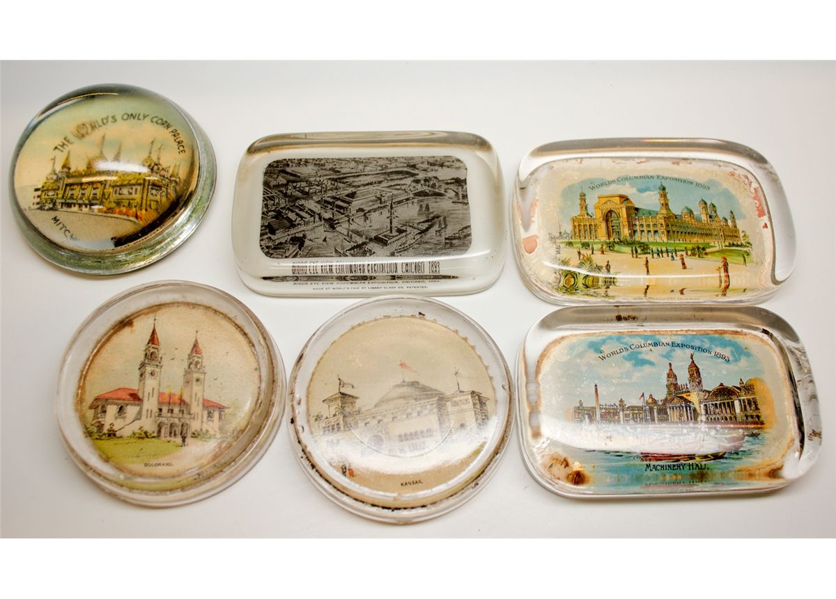 6 Glass Paper Weights from the Columbian Fair. 1) Birdseye View, Made Libby Glass, Horizontal. 2) Electrical Building, Horizontal. 3) Machinery Hall, Horizontal. 4) Corn Palace, Mithcell South, Round. 5) Colorado Building, Round. 6) Kansas Building, Round -60011