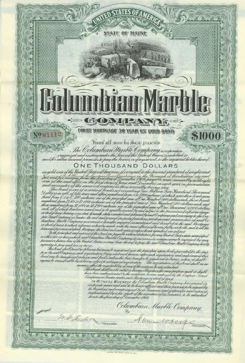 1909 Maine. $1000 bond bearing 6% interest. Green/Black. Vignette at top center of workers at marble quarry.