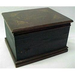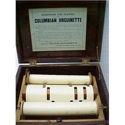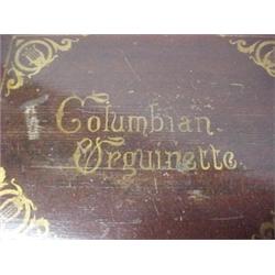 Columbian Orguinette, with four paper music rolls, manufactured by the Bates Organ Manuf'g Co. Boston, Mass., works, measures 8" high x 12" across x 9 1/4" deep, late Victorian Estimate 150/300