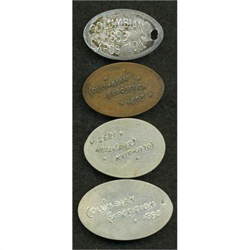 <B>Columbian World's Fair Elongated Coin Group Lot.</B></I> Elongated coins listed by their Martin-Dow catalog numbers and the host coin's date: Ill-WCE-3a on an 1893 Liberty nickel; Ill-WCE-4 on an 1891 Liberty nickel; Ill-WCE-4 on an 1888 Indian cent; and Ill-WCE-1d on an 1875 Seated Liberty dime.<BR><BR><b>Shipping:</b> Coins & Currency (<a target="_blank" href="http://www.heritageauctions.com/common/shipping.php">view shipping information</a>)