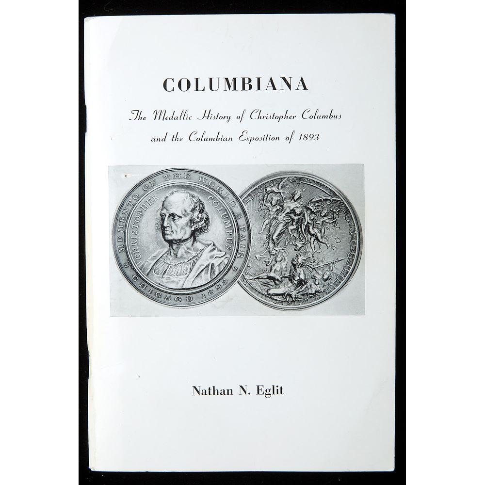 Columbiana; The Medallic History of Christopher Columbus and the Columbian Exposition, by Nathan Eglit. Signed by author. Excellent condition. This is the original and essential reference on Worlds Columbian Exposition medals. Self published by the author and printed by Hewitt Brothers of Chicago. Signed to Charles Pudenski sp? in side front cover. Soft cover, illustrated and 144 pages. Estimated Value 75 - UP