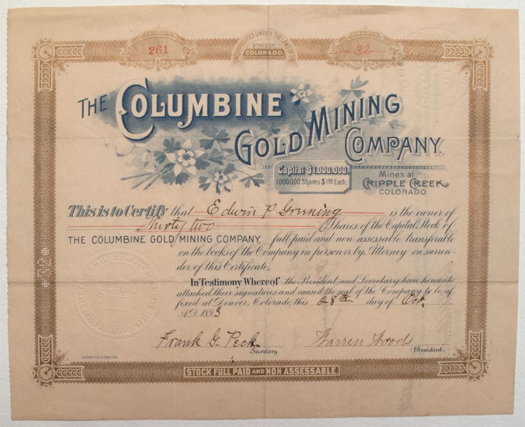 Incorporated in Colorado. Cert. #261 issued to Edwin P. Greening in 1893 for 32 shares. Signed by Warren Woods, president, and Frank G. Peck, secretary. U/C. Printer: Denver Lith. Co. “Mines at Cripple Creek Colorado” printed beneath masthead. This early certificate is in Fine condition.City: Cripple CreekCounty: TellerState: CO