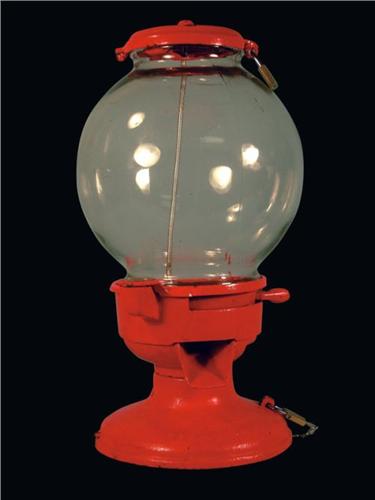 Columbus Gum Ball Vendor, w/o gumballs, red lid. Padlock with keys, missing trap door. 16 1/2 inches tall.