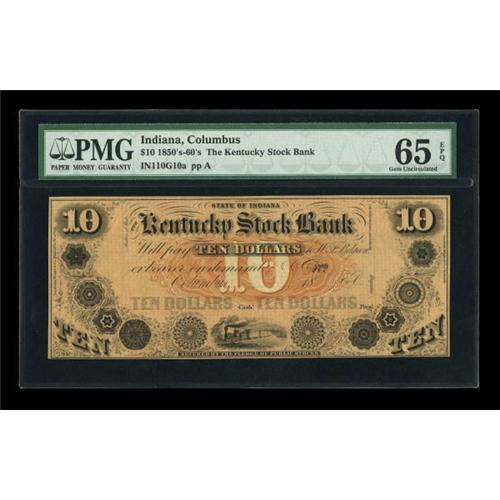 <B>Columbus, IN- Kentucky Stock Bank</B></I> $10 18__ G10a Wolka 128-6<BR> This is our first offering of a note on this bank - not surprising since Wolka gives this note his highest rarity rating of R7. This bank at its inception was partially backed with bonds of the state of Kentucky, and thus the name. The last reported outstanding circulation for this bank was a mere $3481 on October 31, 1875. <B>PMG</B></I> <B>Gem Uncirculated 65 EPQ</B></I>.<BR><BR><b>Shipping:</b> Coins & Currency (<a target="_blank" href="http://www.heritageauctions.com/common/shipping.php">view shipping information</a>)