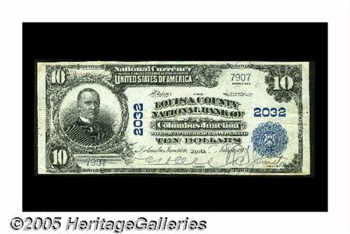 <B>Columbus Junction, IA</B></I> - $10 1902 Plain Back Fr. 628 <B>The Louisa County NB</B></I> Ch. # 2032<BR>This <B>Very Fine</B></I> example is nicely margined and retains sharp signatures. The only distractions worth mentioning are multiple pinholes peppering the right and left sides. Otherwise it is quite attractive.
