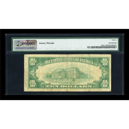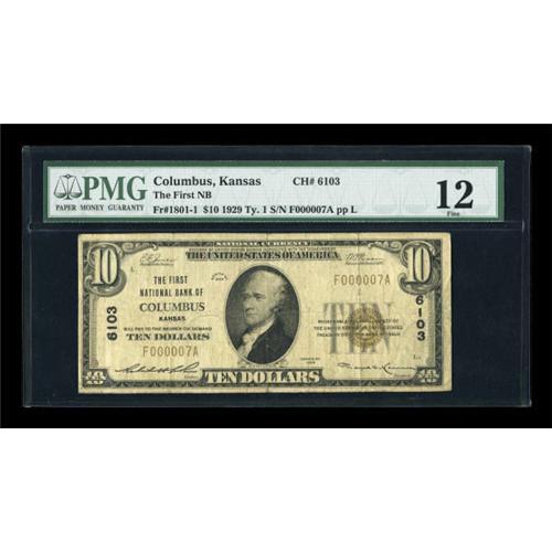 <B>Columbus, KS</B></I> - $10 1929 Ty. 1 <B>The First NB</B></I> Ch. # 6103<BR> Serial number seven is seen on this lightly toned note.<B> PMG Fine 12</B></I>.<BR><BR><b>Shipping:</b> Coins & Currency (<a target="_blank" href="http://www.heritageauctions.com/common/shipping.php">view shipping information</a>)