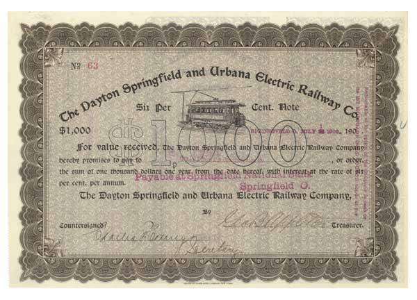 1903. Ohio. $1000 bond bearing 6% interest. Green/Black. Vignette of electric streetcar at center. Stamp cancelled. Very fine.