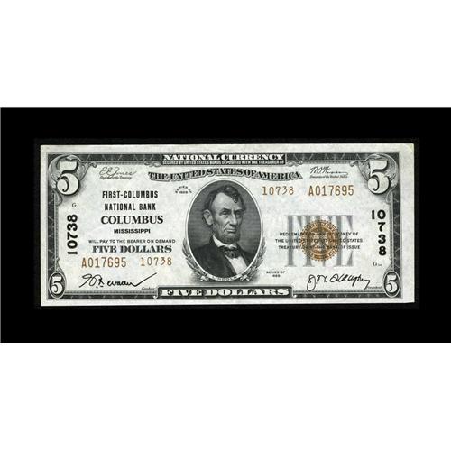 <B>Columbus, MS</B></I> - $5 1929 Ty. 2 <B>First-Columbus NB</B></I> Ch. # 10738<BR>Bright paper, prominent embossing, and dark inks highlight this $5 from an uncirculated run of notes on this bank. <B>Choice About Uncirculated.</B></I>